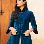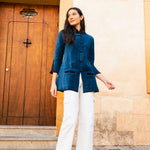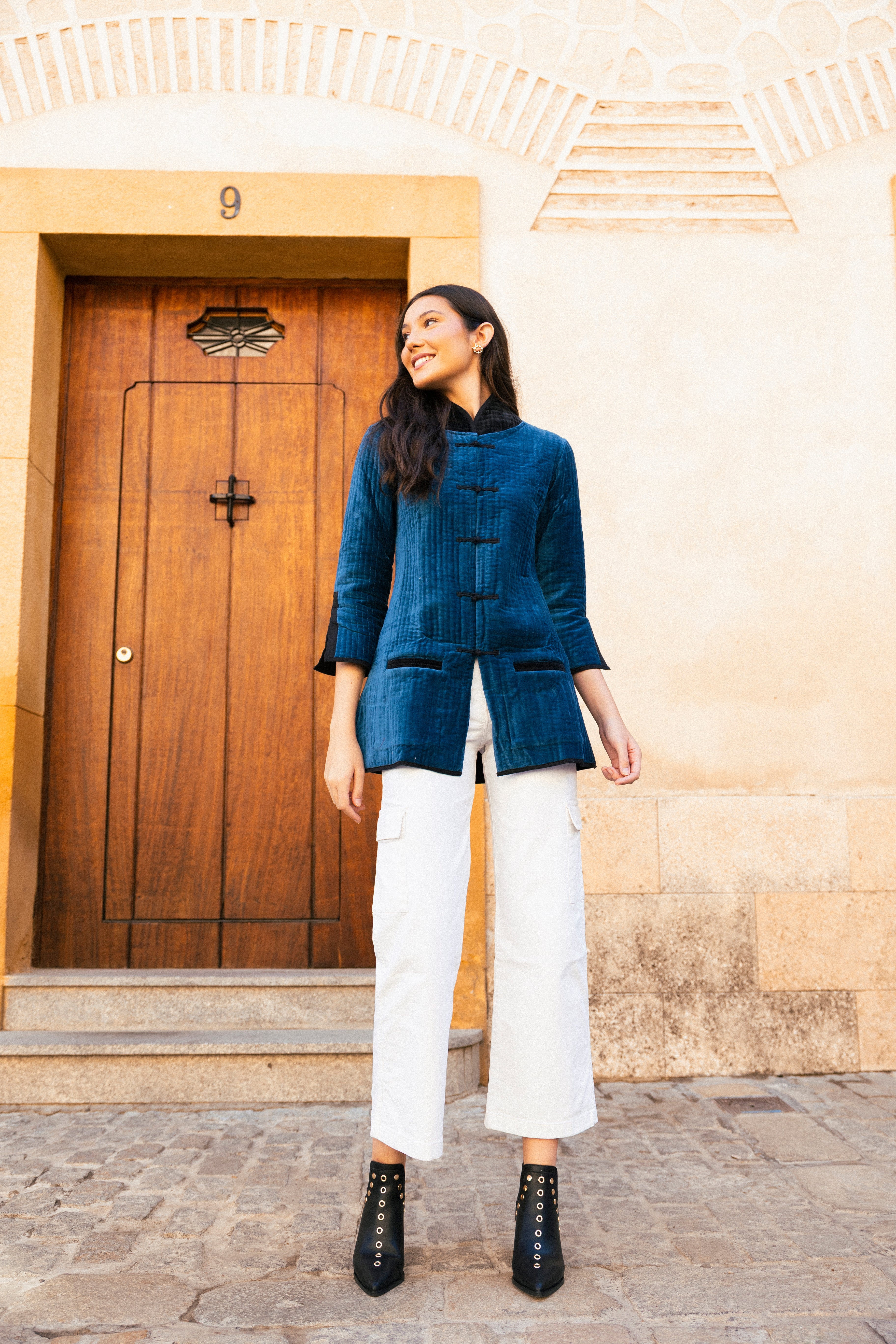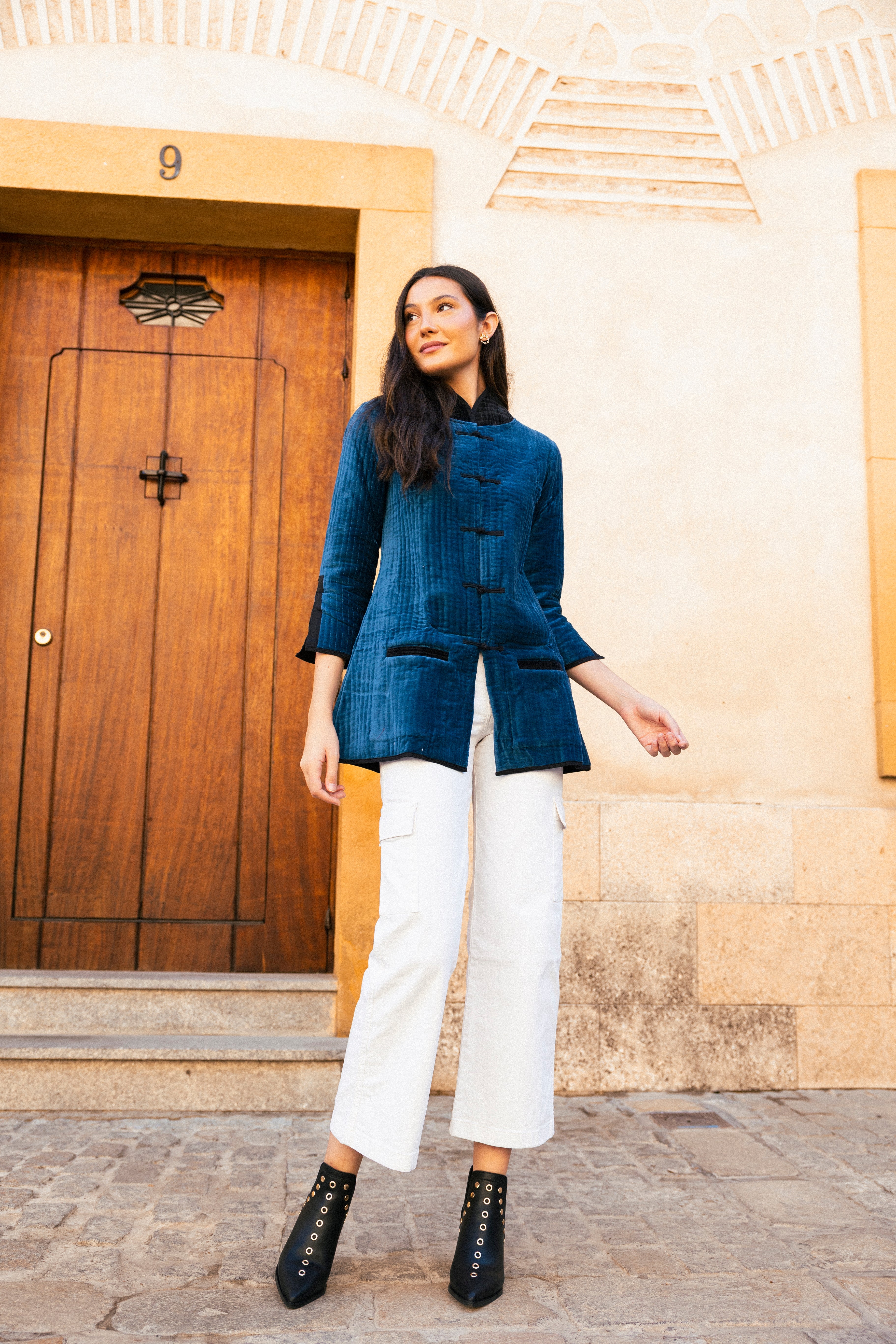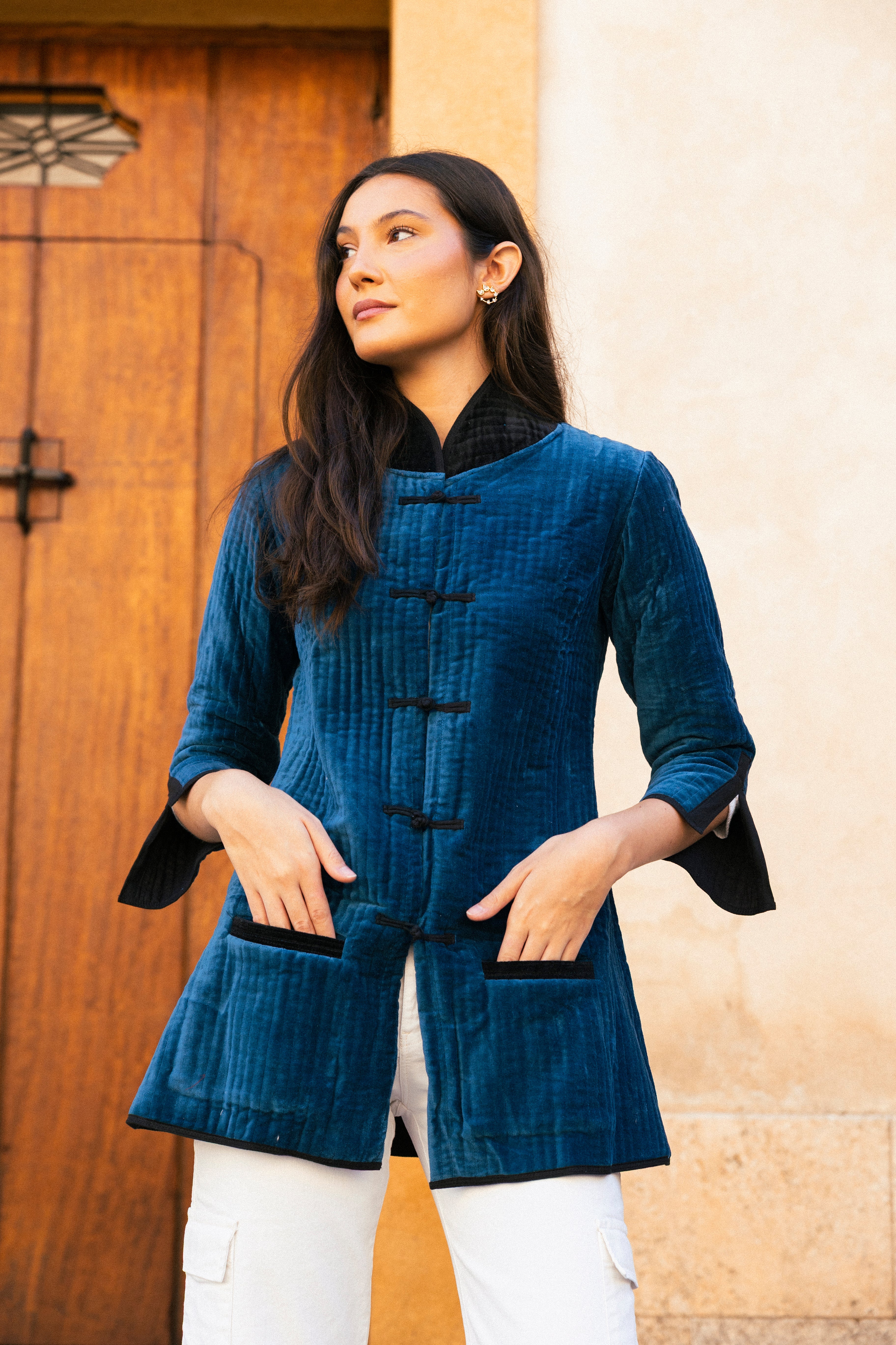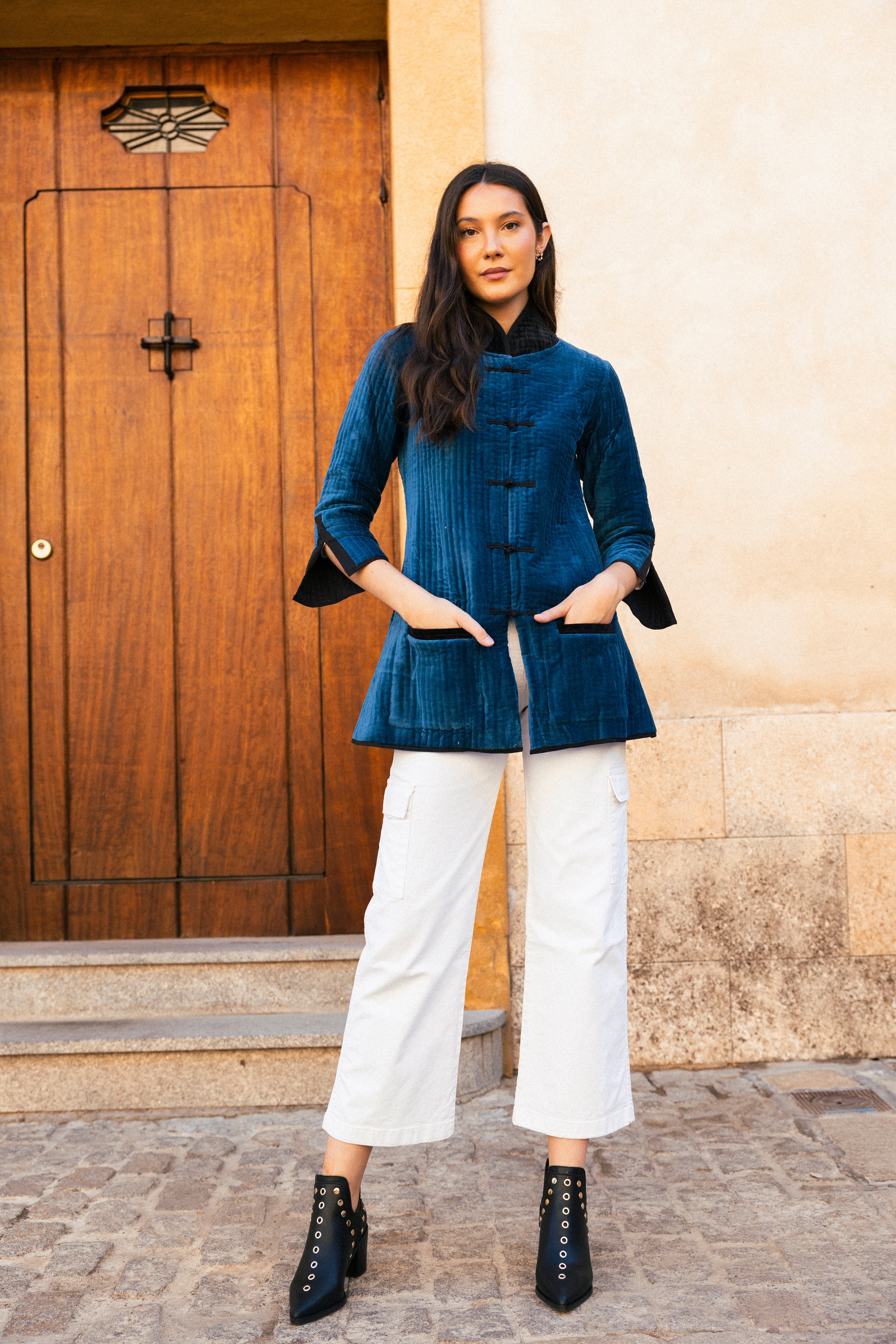 Chaqueta de terciopelo, abotonada por delante. Cuenta con dos bolsillos delanteros inferiores sin cierre.