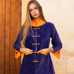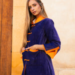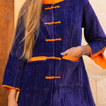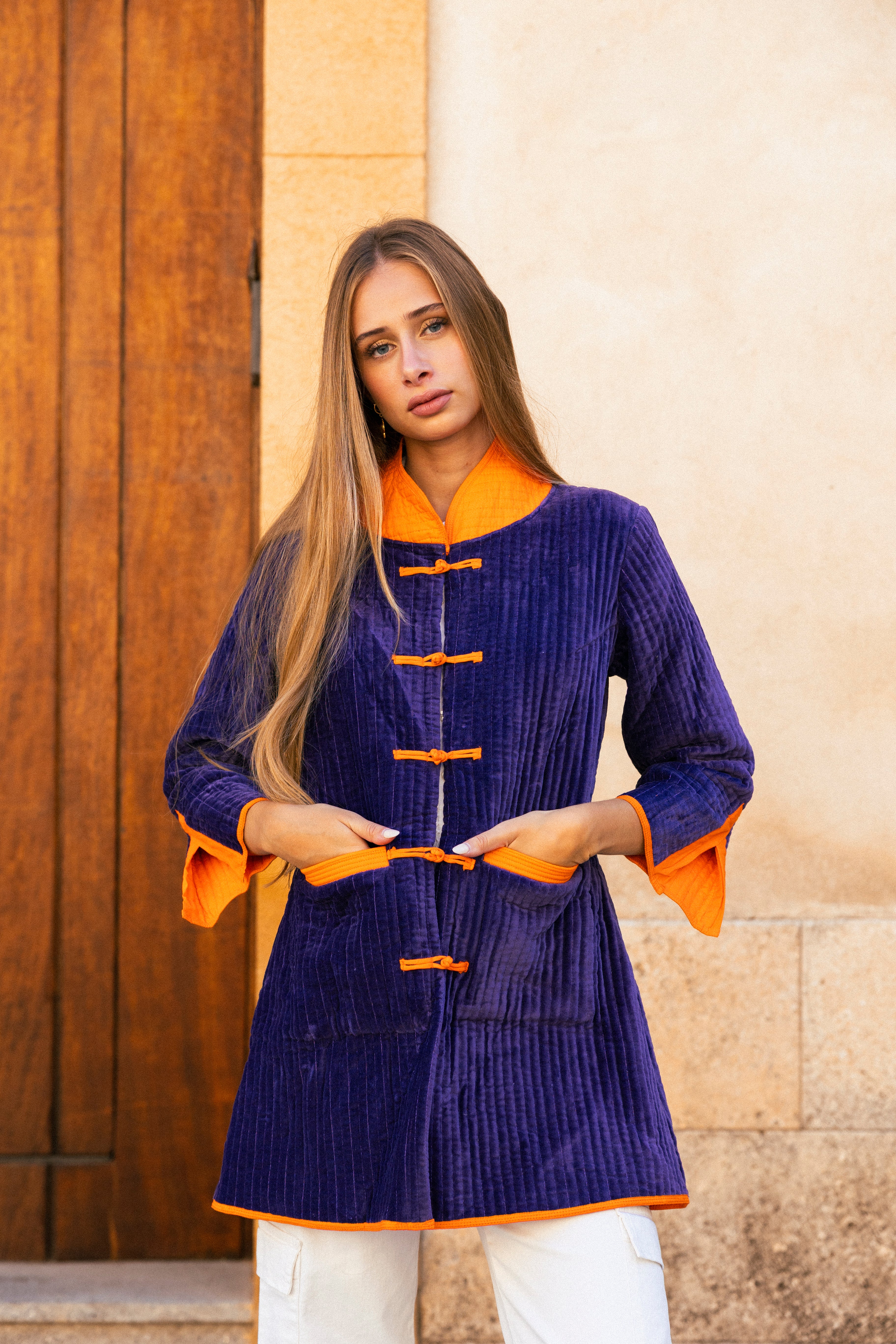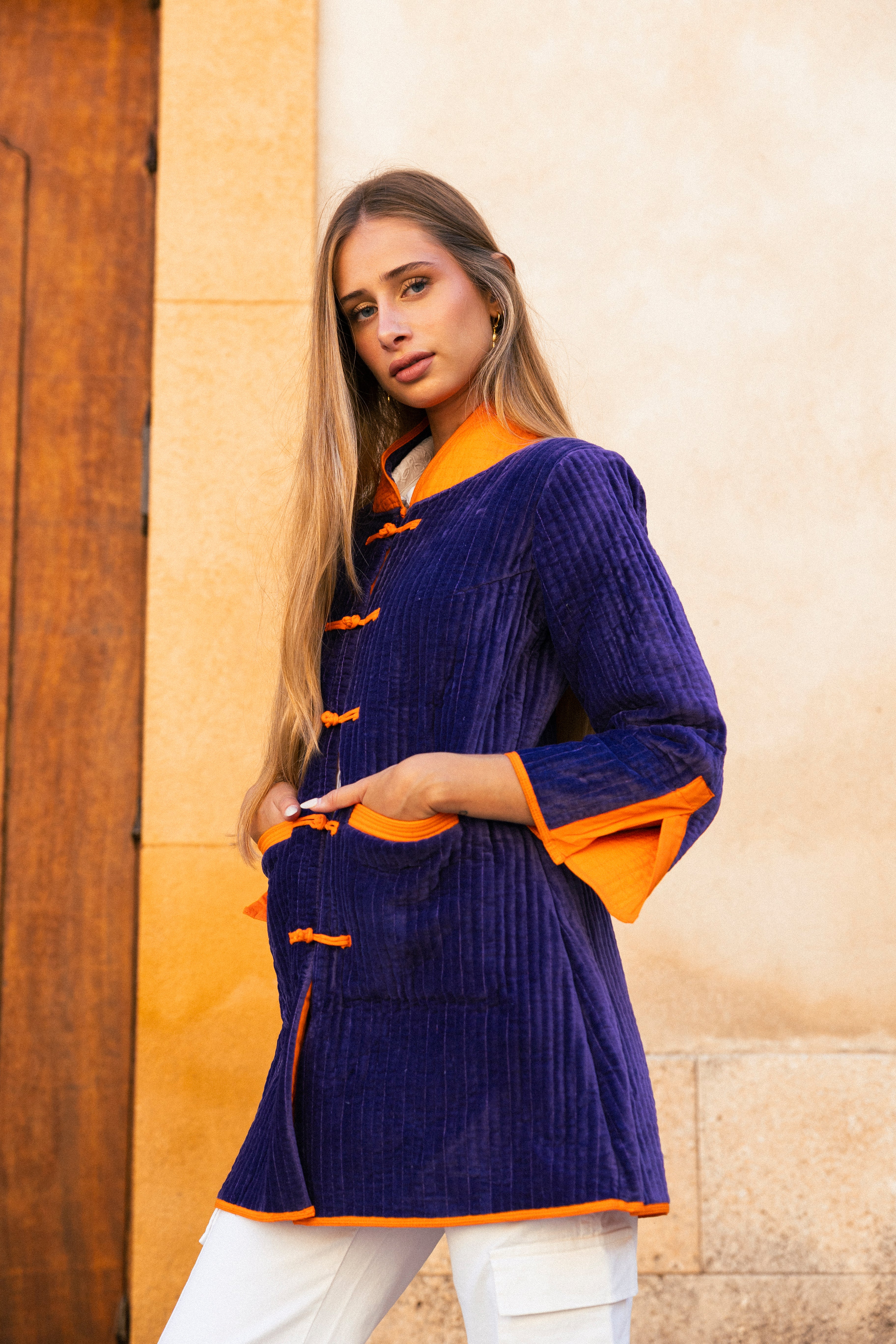 Chaqueta de terciopelo, abotonada por delante. Cuenta con dos bolsillos delanteros inferiores sin cierre.