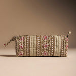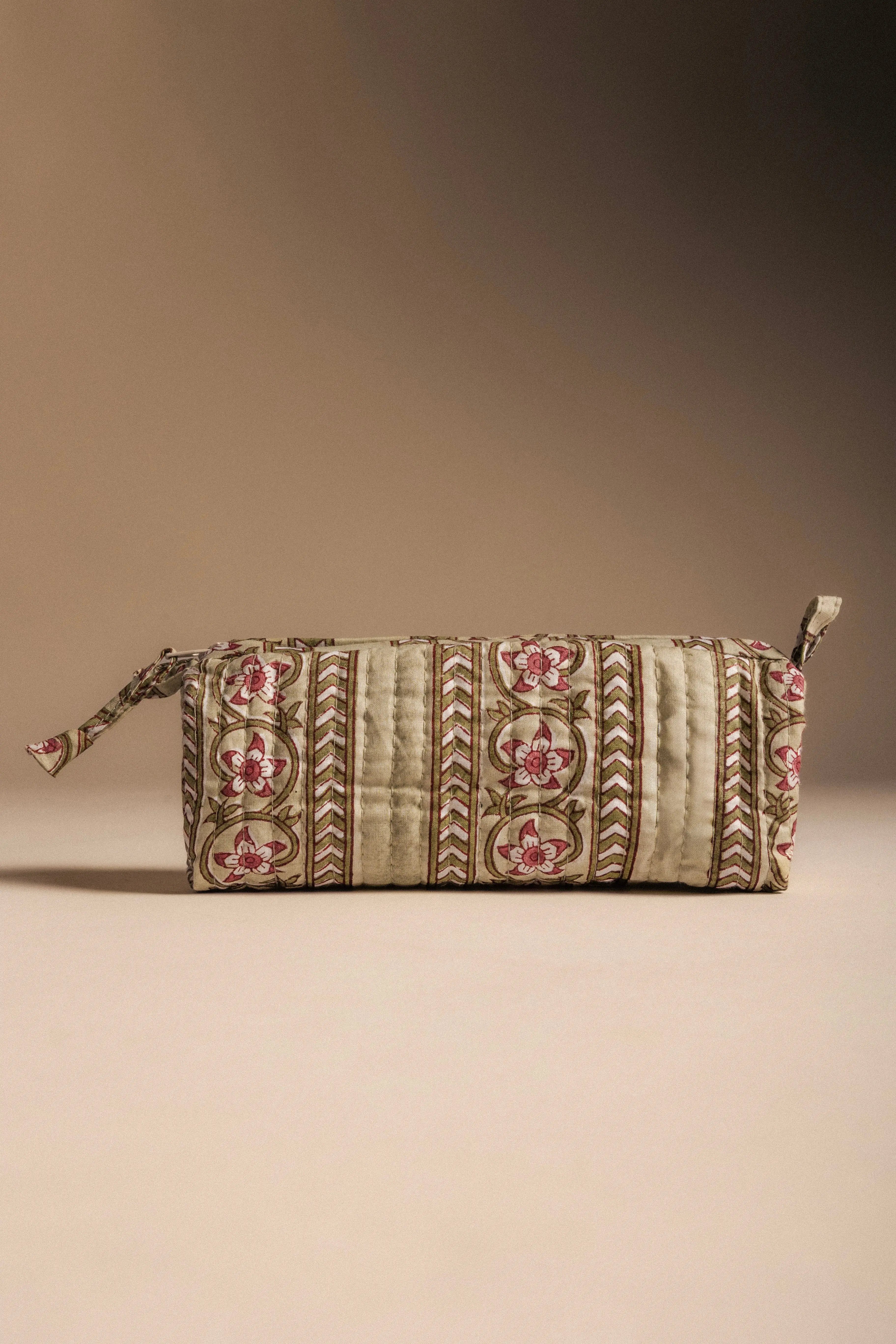 Estuche de algodón estampado con cierre superior con cremallera.