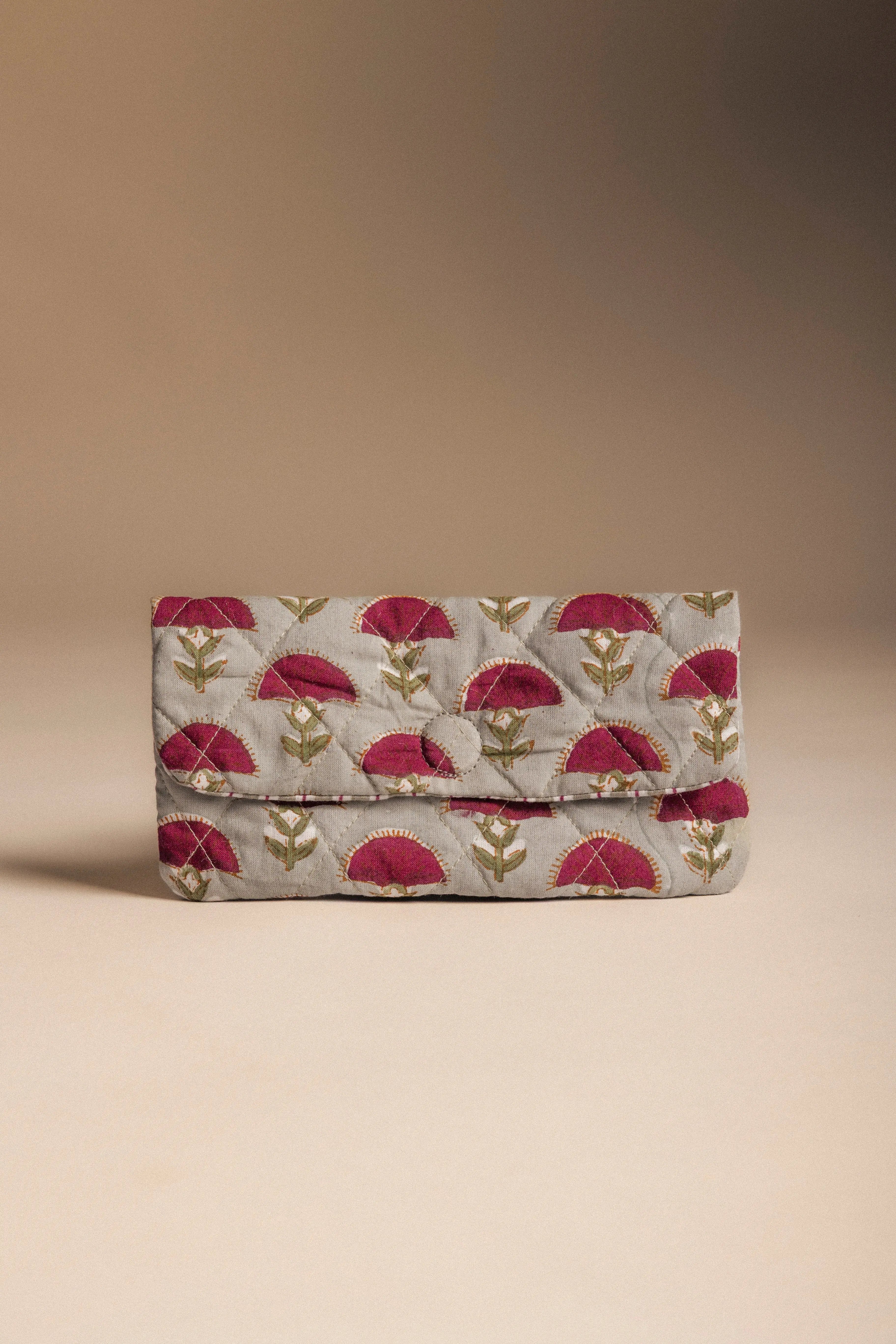 Funda de gafas de sol de algodón estampado con estructura en forma de sobre. Tiene cierre con imán invisible.