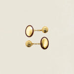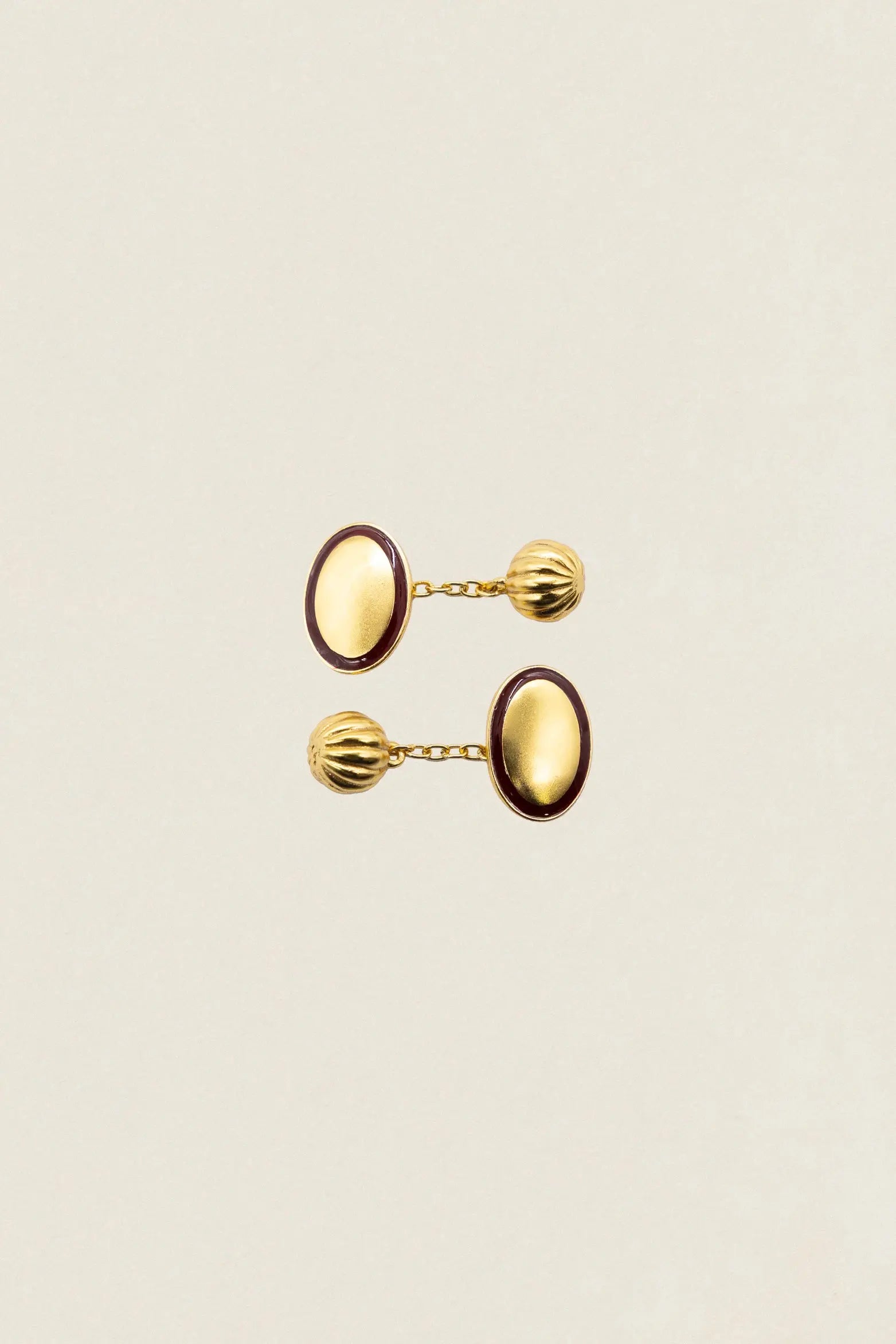 Estos refinados gemelos para hombre presentan un diseño clásico y distinguido: una placa ovalada en acabado dorado satinado enmarcada por un elegante borde en tono burdeos, unida mediante una fina cadena a un cierre esférico texturizado. Su estética sobria y sofisticada los convierte en un accesorio ideal para estilismos formales. Combínalos con camisas blancas o marfil y trajes en tonos azul marino, gris medio o negro, así como con tejidos de calidad como lana, franela o terciopelo. El burdeos aporta calidez y profundidad, armonizando perfectamente con corbatas en tonos vino, azul oscuro o beige, logrando un conjunto elegante y equilibrado, perfecto para eventos especiales o contextos profesionales.