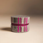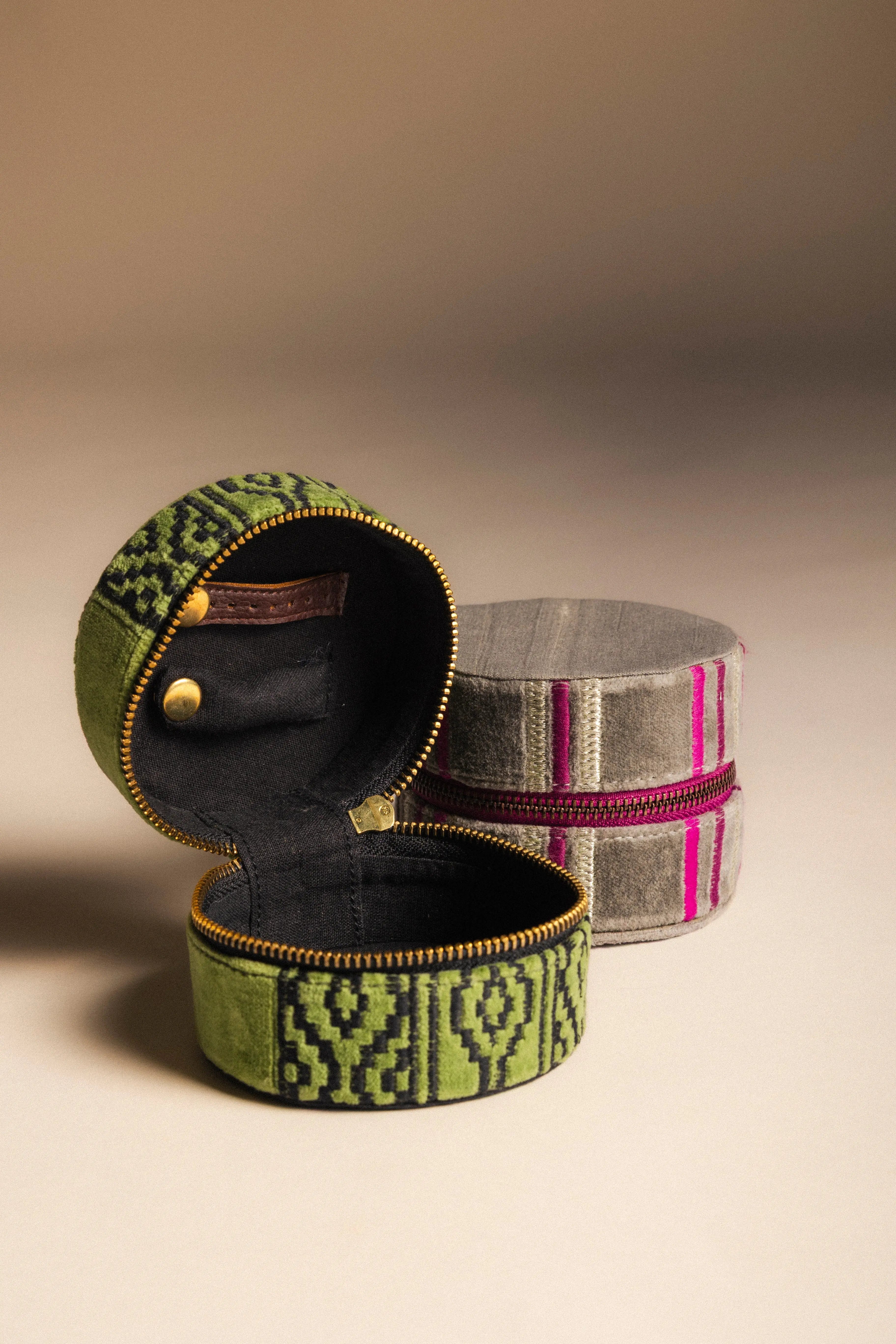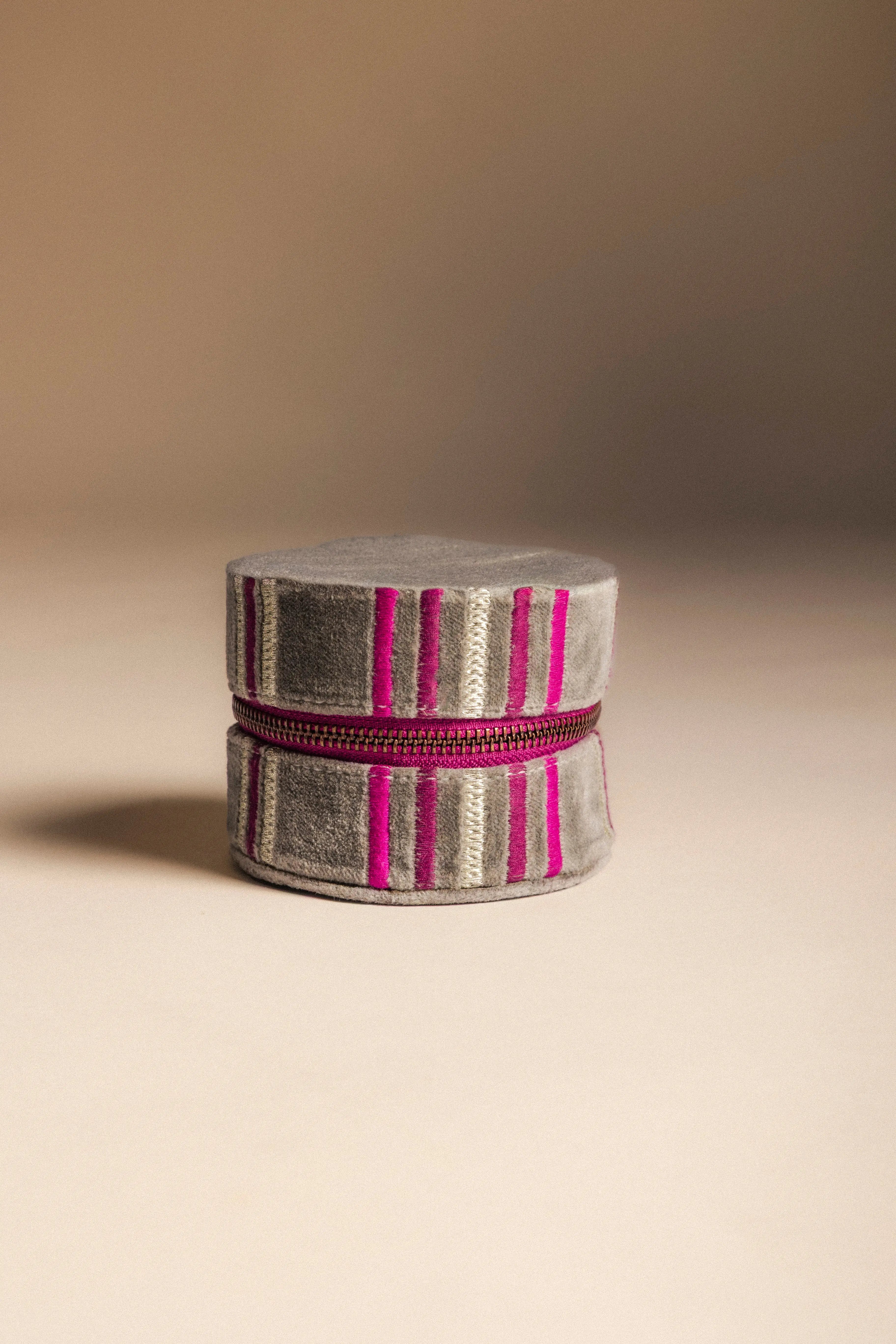 Neceser/Joyero de terciopelo cilíndrico, con estampado bordado. Cierre superior con cremallera circular y borlón decorativo. Cuenta también con asa en la parte superior.