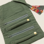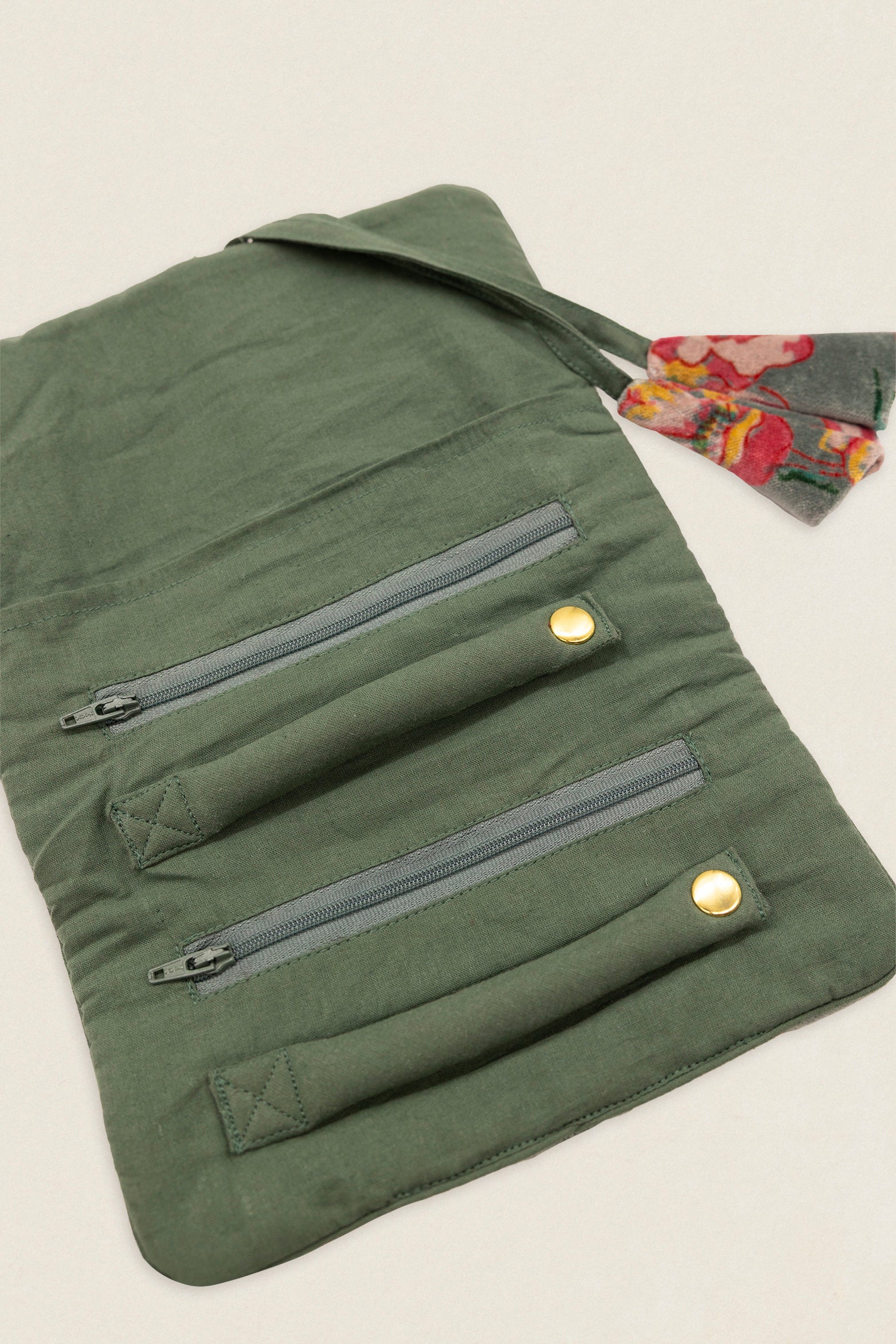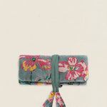 Joyero de viaje de algodón con estampado bordado. Tiene cierre mediante lazada, 3 bolsillos internos con cremallera y anillero.
