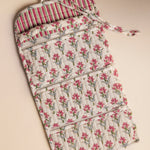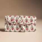 Joyero de viaje de algodón con estampado bordado. Tiene cierre mediante lazada, 3 bolsillos internos con cremallera y anillero.