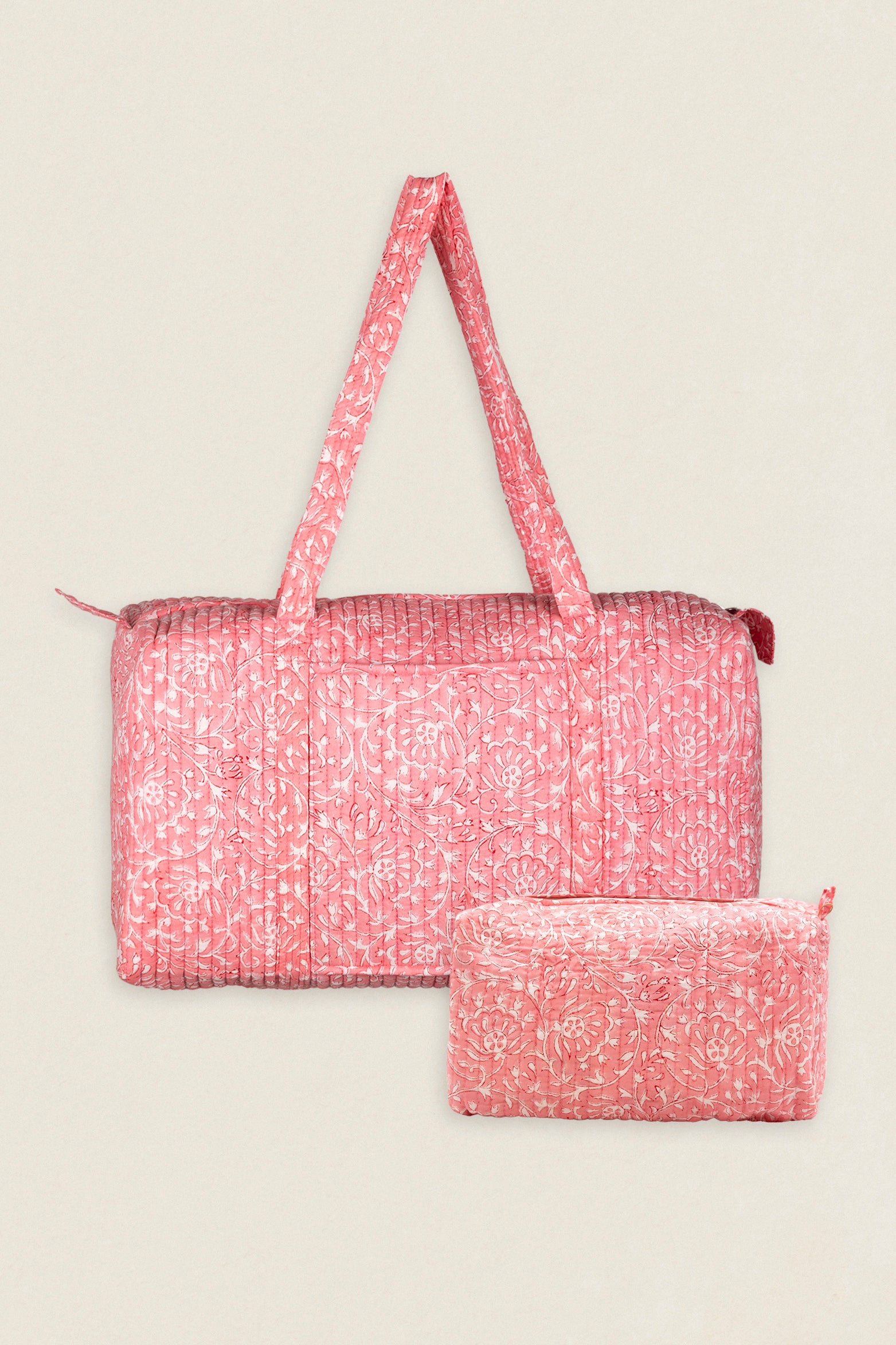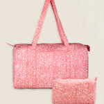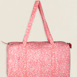 Maleta de viaje de algodón estampado. Cierre superior con cremallera y con dos asas superiores. Cuenta con un bolsillo exterior sin cierre y un bolsillo interior con cremallera.