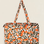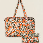 Maleta de viaje de algodón estampado. Cierre superior con cremallera y con dos asas superiores. Cuenta con un bolsillo exterior sin cierre y un bolsillo interior con cremallera.