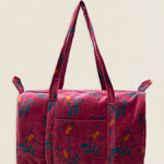 Maleta de viaje de algodón estampado. Cierre superior con cremallera y con dos asas superiores. Cuenta con un bolsillo exterior sin cierre y un bolsillo interior con cremallera.