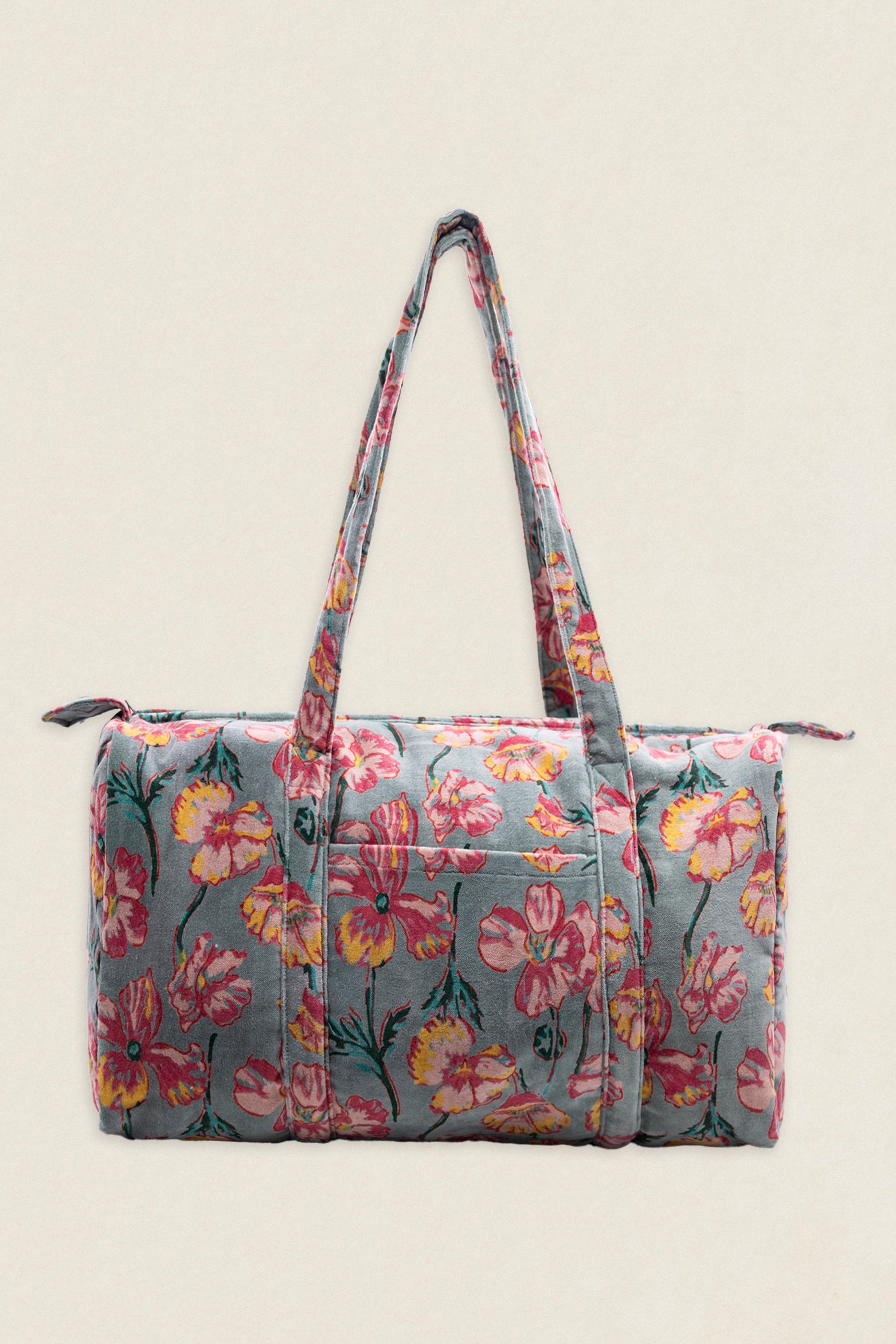 Maleta de viaje de algodón estampado. Cierre superior con cremallera y con dos asas superiores. Cuenta con un bolsillo exterior sin cierre y un bolsillo interior con cremallera.