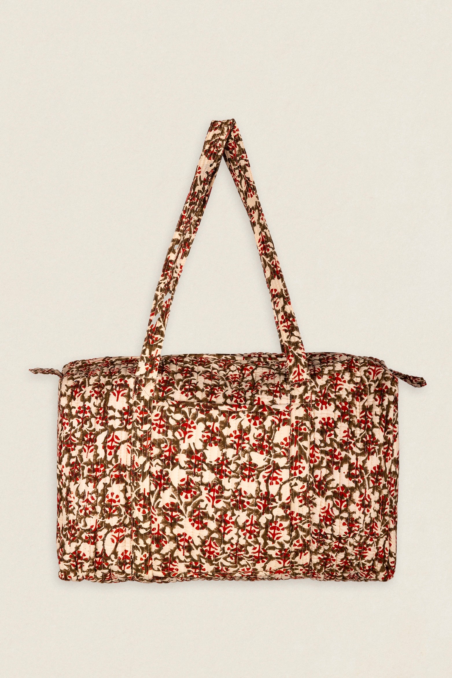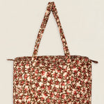 Maleta de viaje de algodón estampado. Cierre superior con cremallera y con dos asas superiores. Cuenta con un bolsillo exterior sin cierre y un bolsillo interior con cremallera.