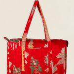 Maleta de viaje de algodón estampado. Cierre superior con cremallera y con dos asas superiores. Cuenta con un bolsillo exterior sin cierre y un bolsillo interior con cremallera.