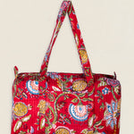Maleta de viaje de algodón estampado. Cierre superior con cremallera y con dos asas superiores. Cuenta con un bolsillo exterior sin cierre y un bolsillo interior con cremallera.