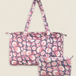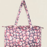 Maleta de viaje de algodón estampado. Cierre superior con cremallera y con dos asas superiores. Cuenta con un bolsillo exterior sin cierre y un bolsillo interior con cremallera.