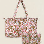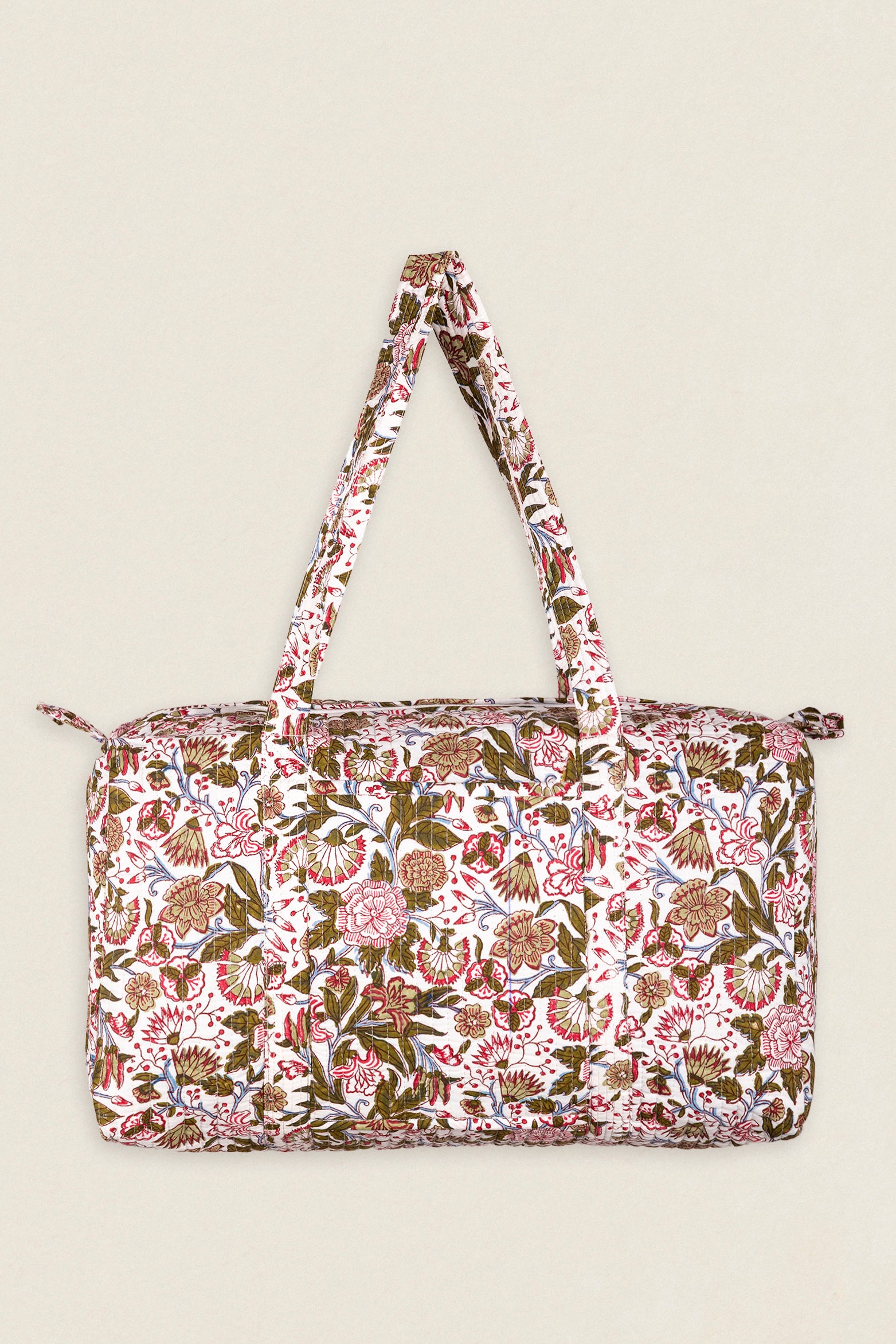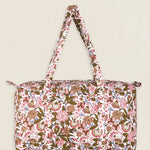 Maleta de viaje de algodón estampado. Cierre superior con cremallera y con dos asas superiores. Cuenta con un bolsillo exterior sin cierre y un bolsillo interior con cremallera.