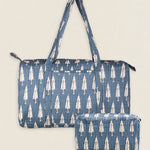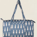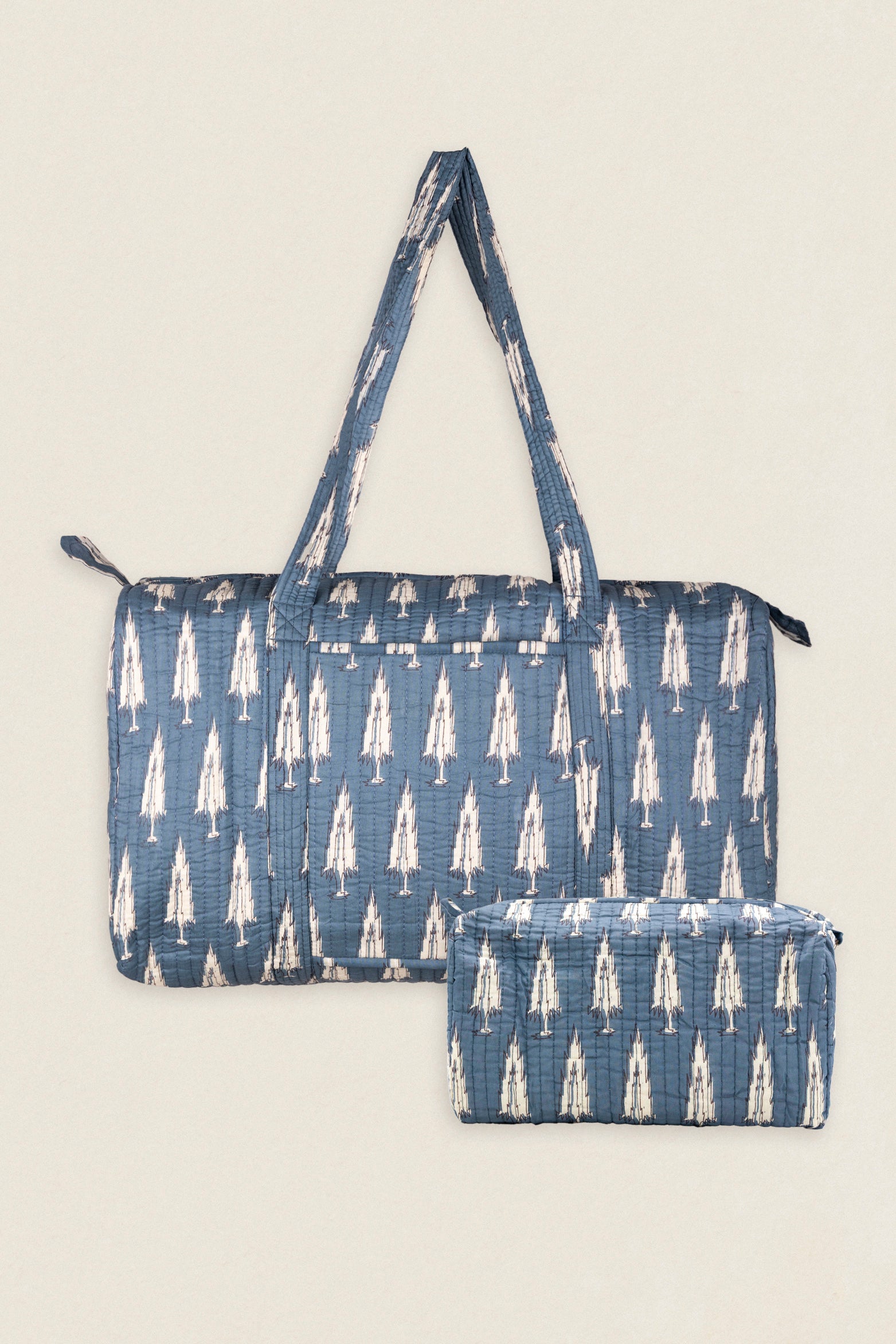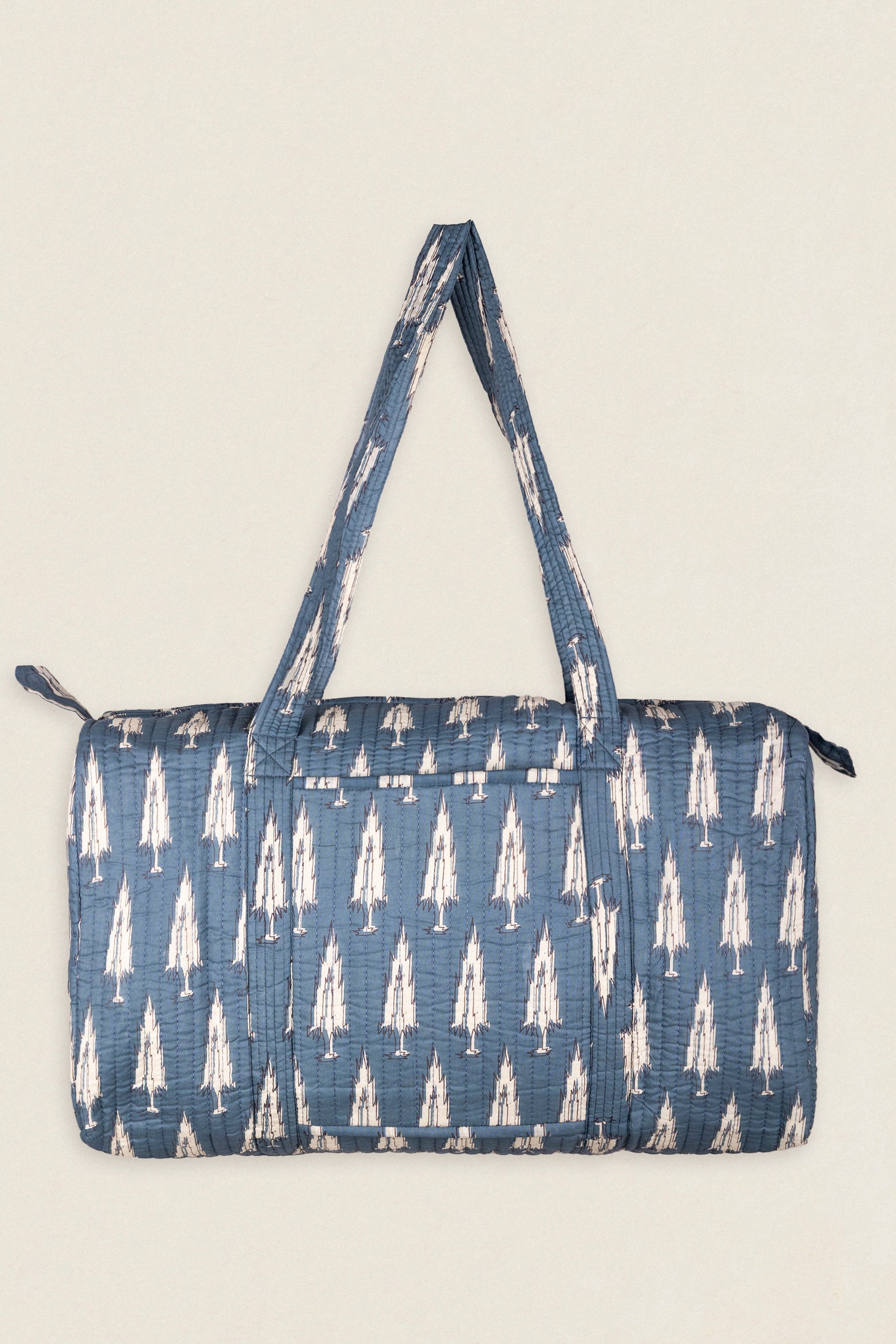 Maleta de viaje de algodón estampado. Cierre superior con cremallera y con dos asas superiores. Cuenta con un bolsillo exterior sin cierre y un bolsillo interior con cremallera.