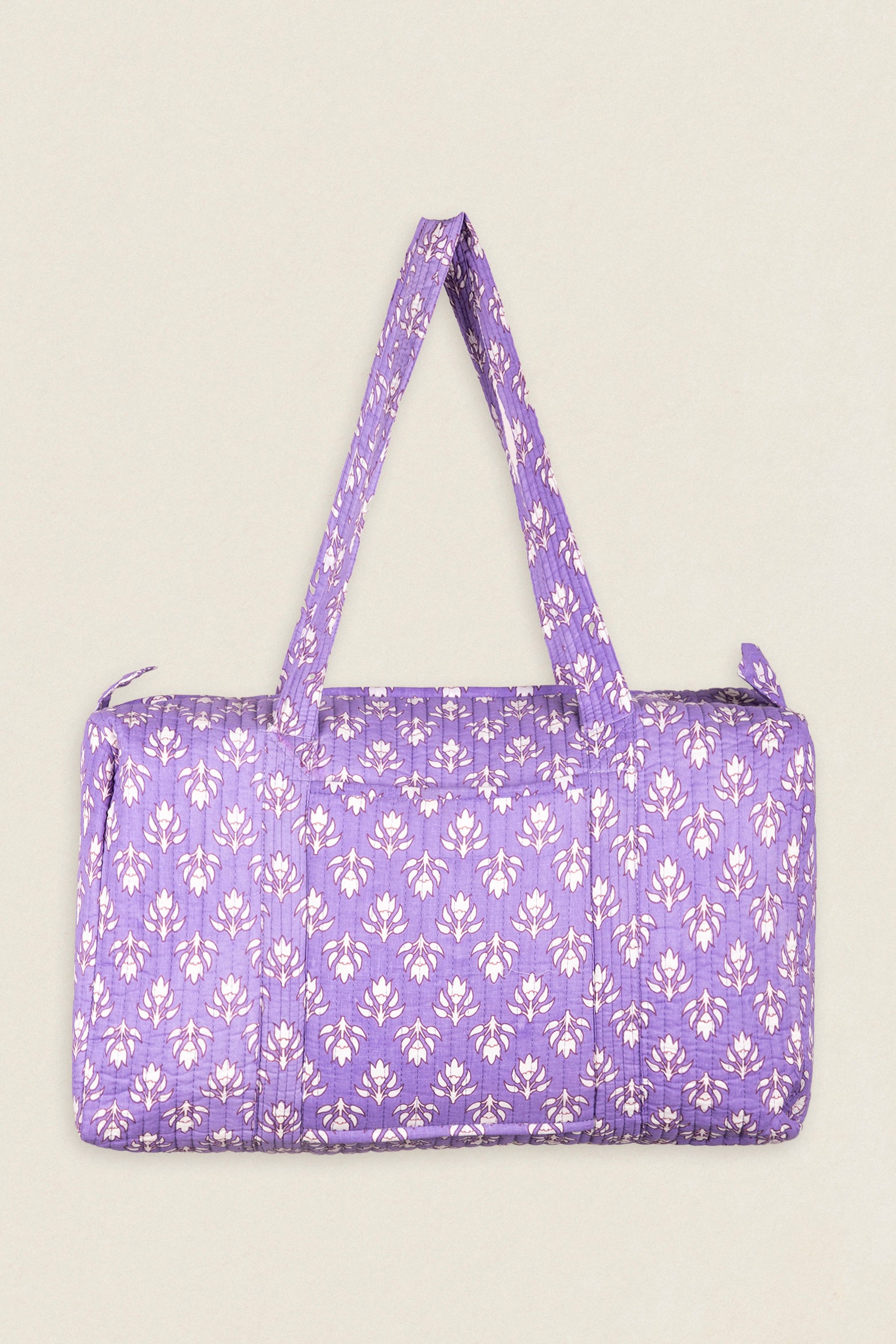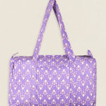 Maleta de viaje de algodón estampado. Cierre superior con cremallera y con dos asas superiores. Cuenta con un bolsillo exterior sin cierre y un bolsillo interior con cremallera.