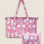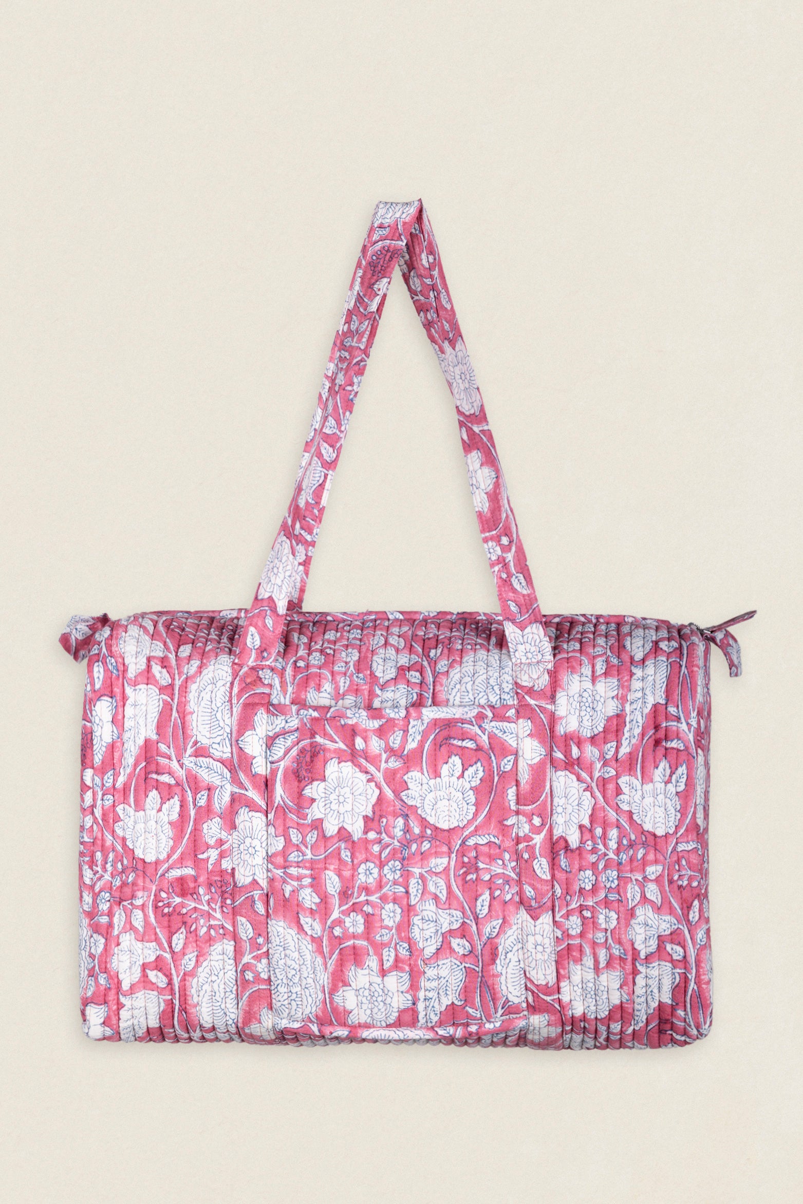 Maleta de viaje de algodón estampado. Cierre superior con cremallera y con dos asas superiores. Cuenta con un bolsillo exterior sin cierre y un bolsillo interior con cremallera.