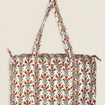 Maleta de viaje de algodón estampado. Cierre superior con cremallera y con dos asas superiores. Cuenta con un bolsillo exterior sin cierre y un bolsillo interior con cremallera.
