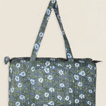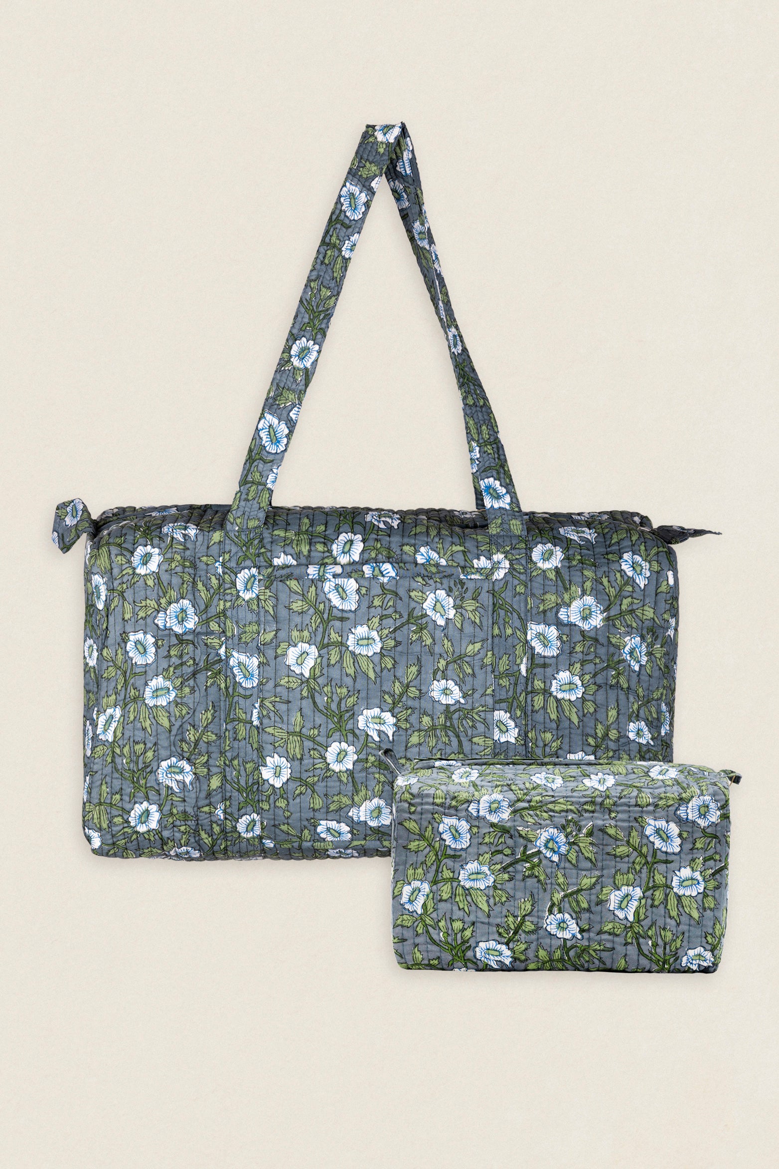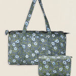 Maleta de viaje de algodón estampado. Cierre superior con cremallera y con dos asas superiores. Cuenta con un bolsillo exterior sin cierre y un bolsillo interior con cremallera.