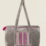 Maleta de viaje de algodón estampado. Cierre superior con cremallera y con dos asas superiores. Cuenta con un bolsillo exterior sin cierre y un bolsillo interior con cremallera.