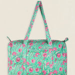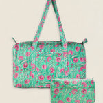 Maleta de viaje de algodón estampado. Cierre superior con cremallera y con dos asas superiores. Cuenta con un bolsillo exterior sin cierre y un bolsillo interior con cremallera.