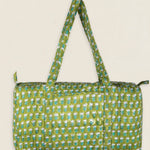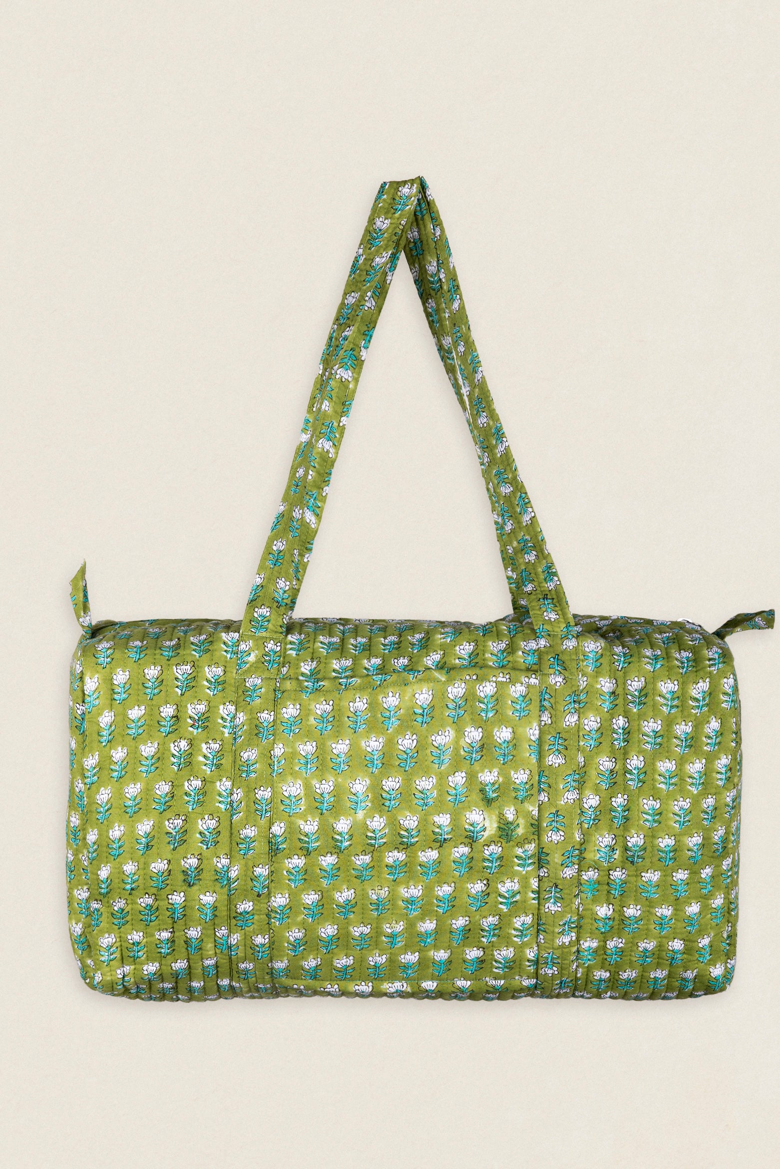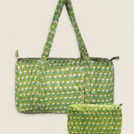 Maleta de viaje de algodón estampado. Cierre superior con cremallera y con dos asas superiores. Cuenta con un bolsillo exterior sin cierre y un bolsillo interior con cremallera.