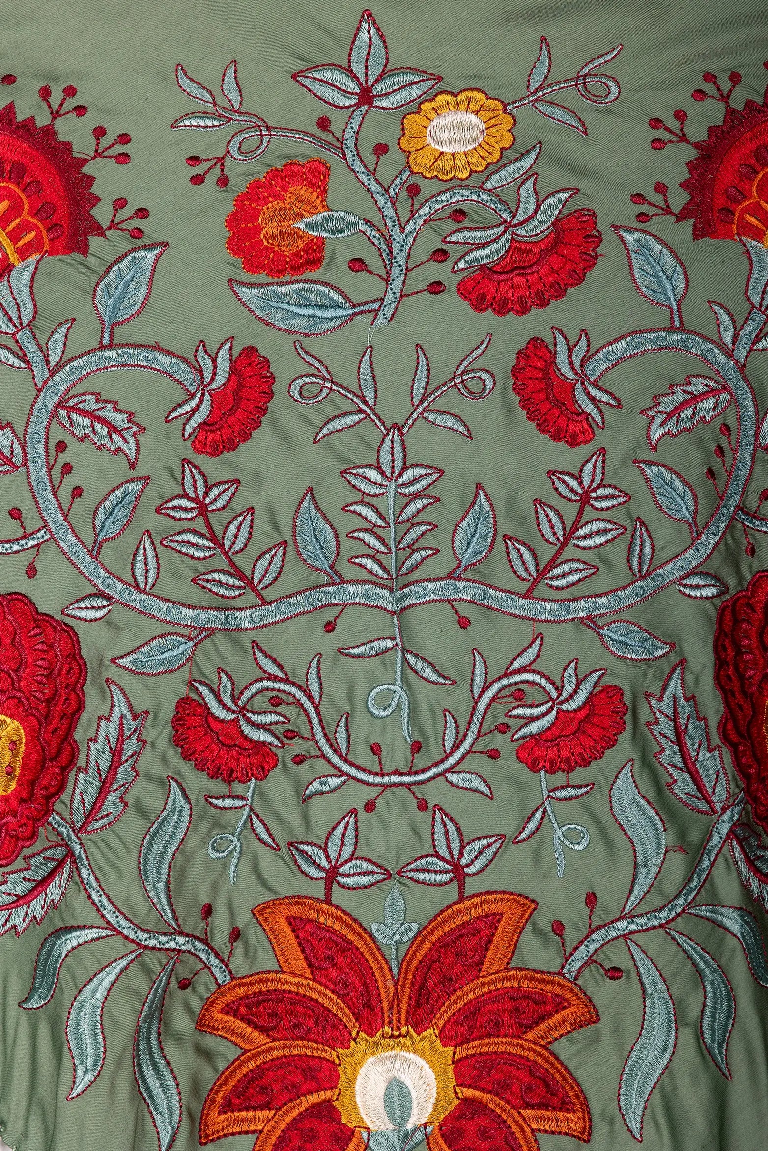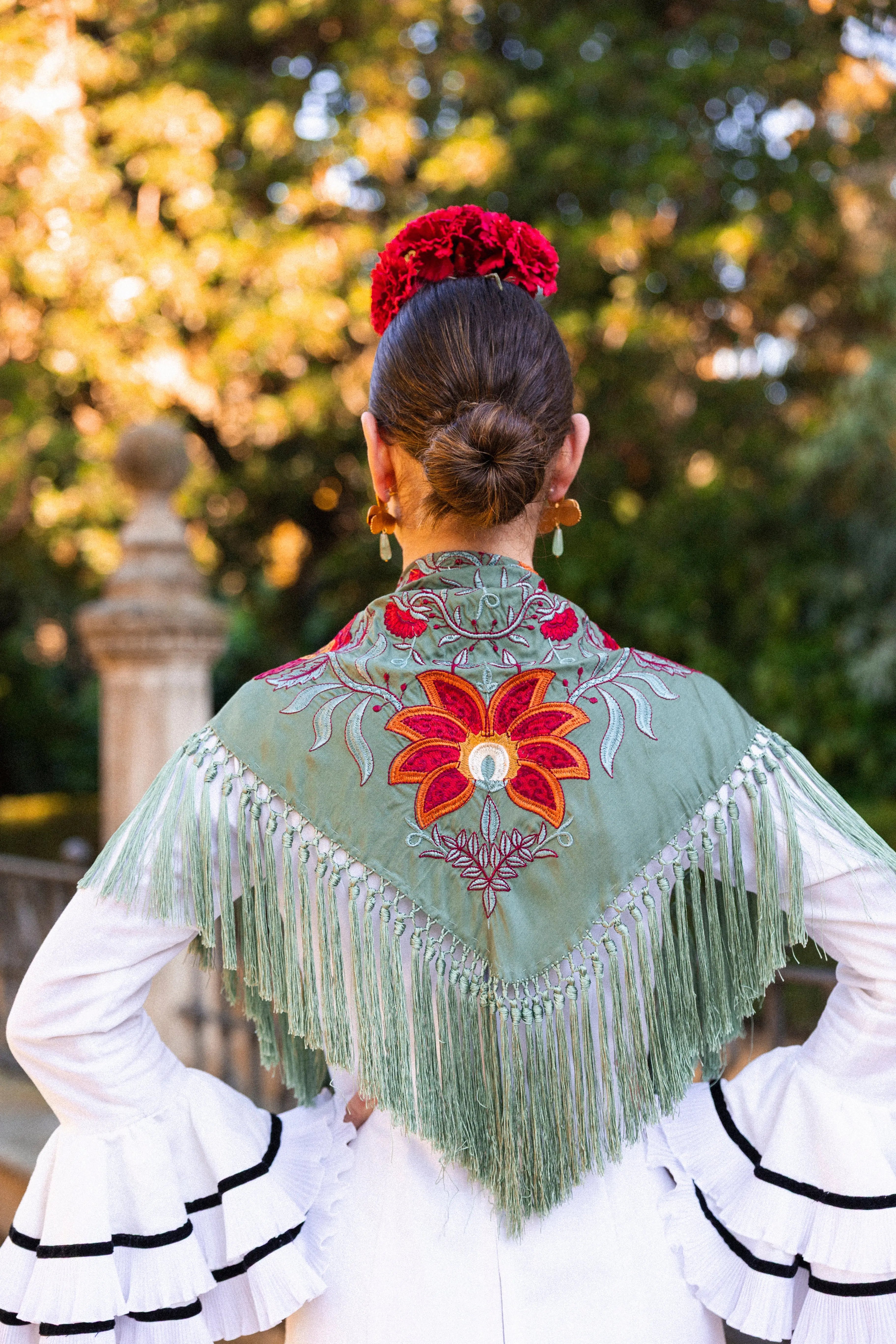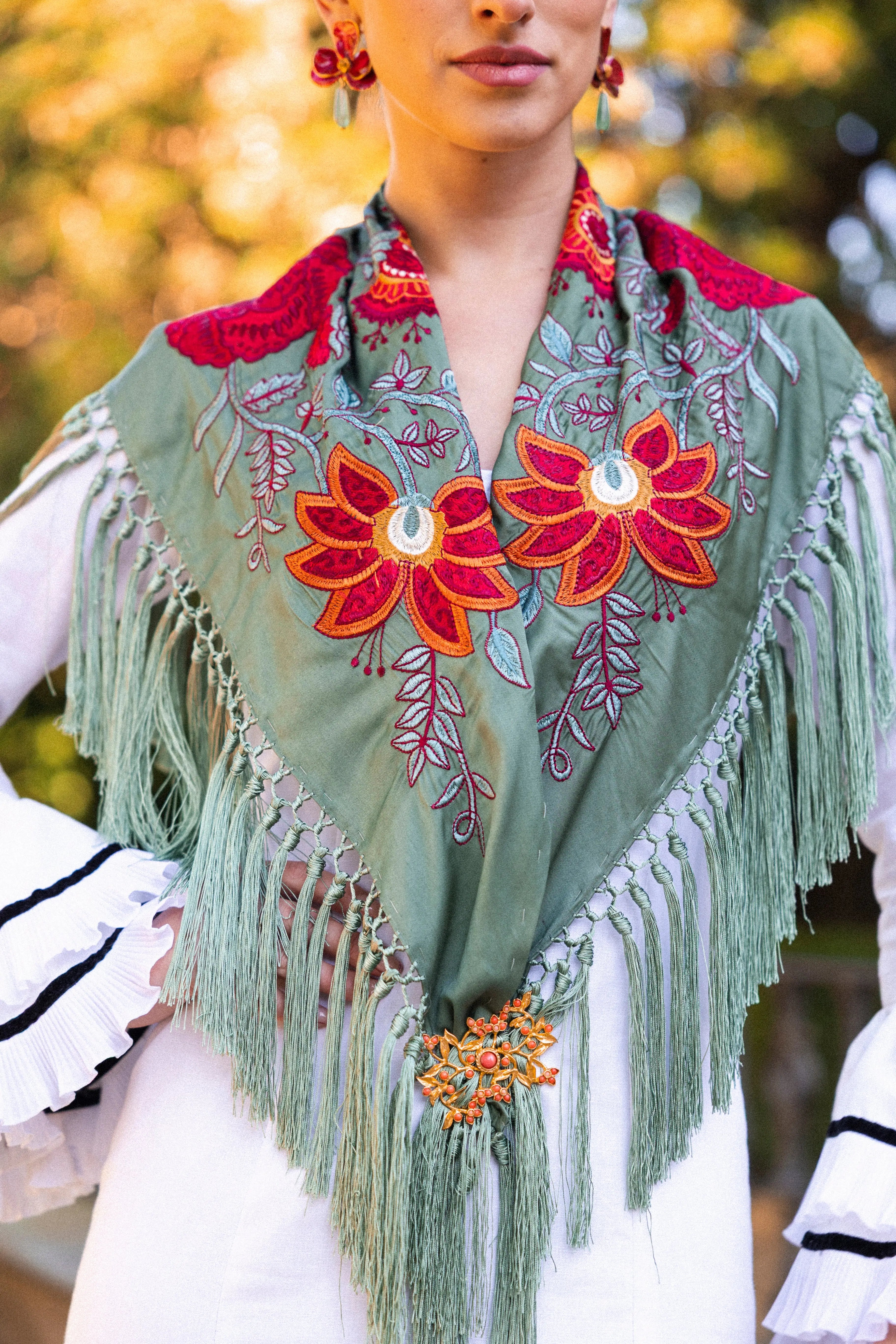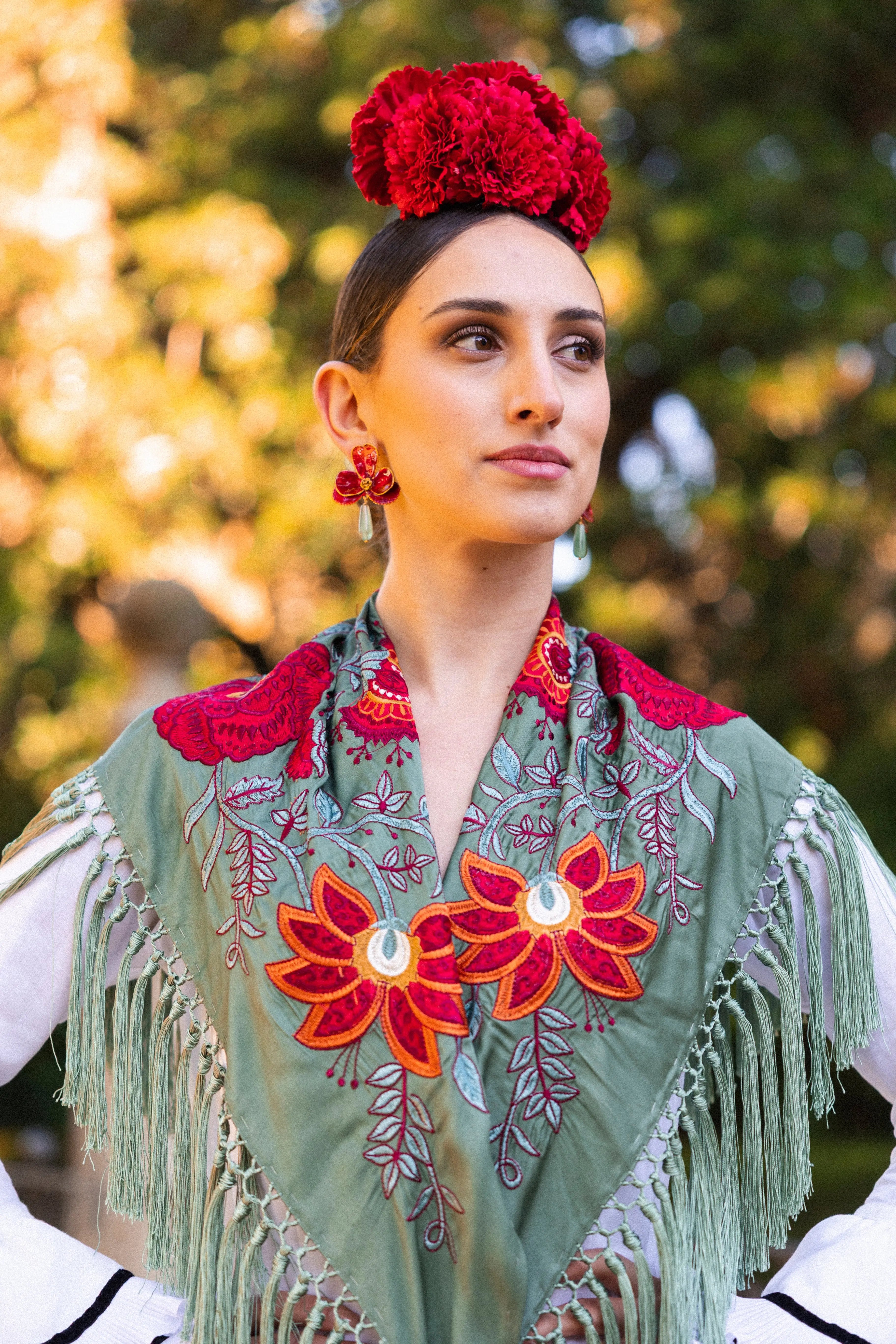 Mantón Camila Verde Viejo Flor Roja M495