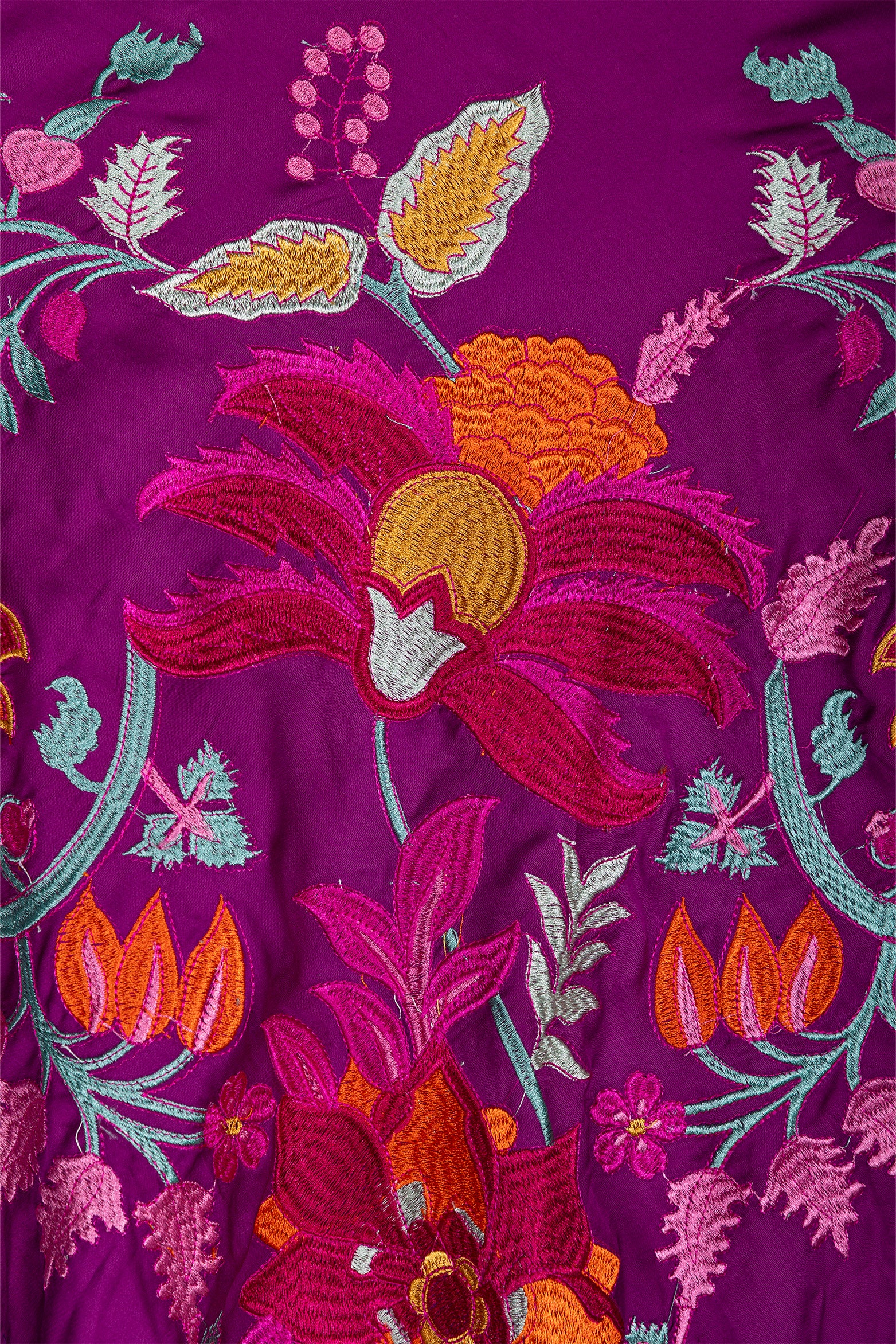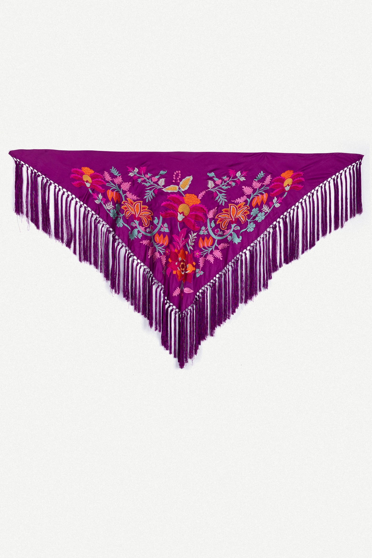 Mantoncillo de viscosa con estampado de flores bordadas en hilo de seda. Flecado a mano con flecos de hilo de seda.