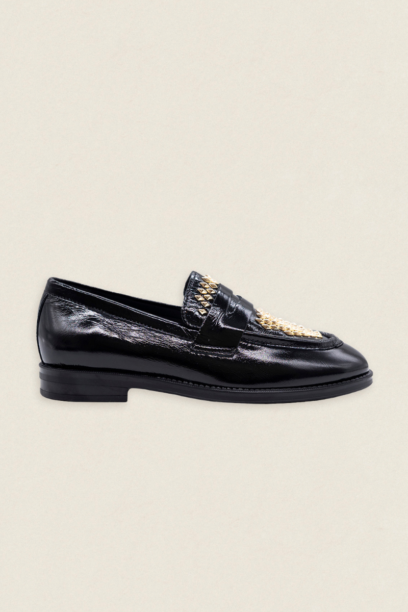 Mocasín Mimi Piel Negro Tachuela Dorada