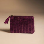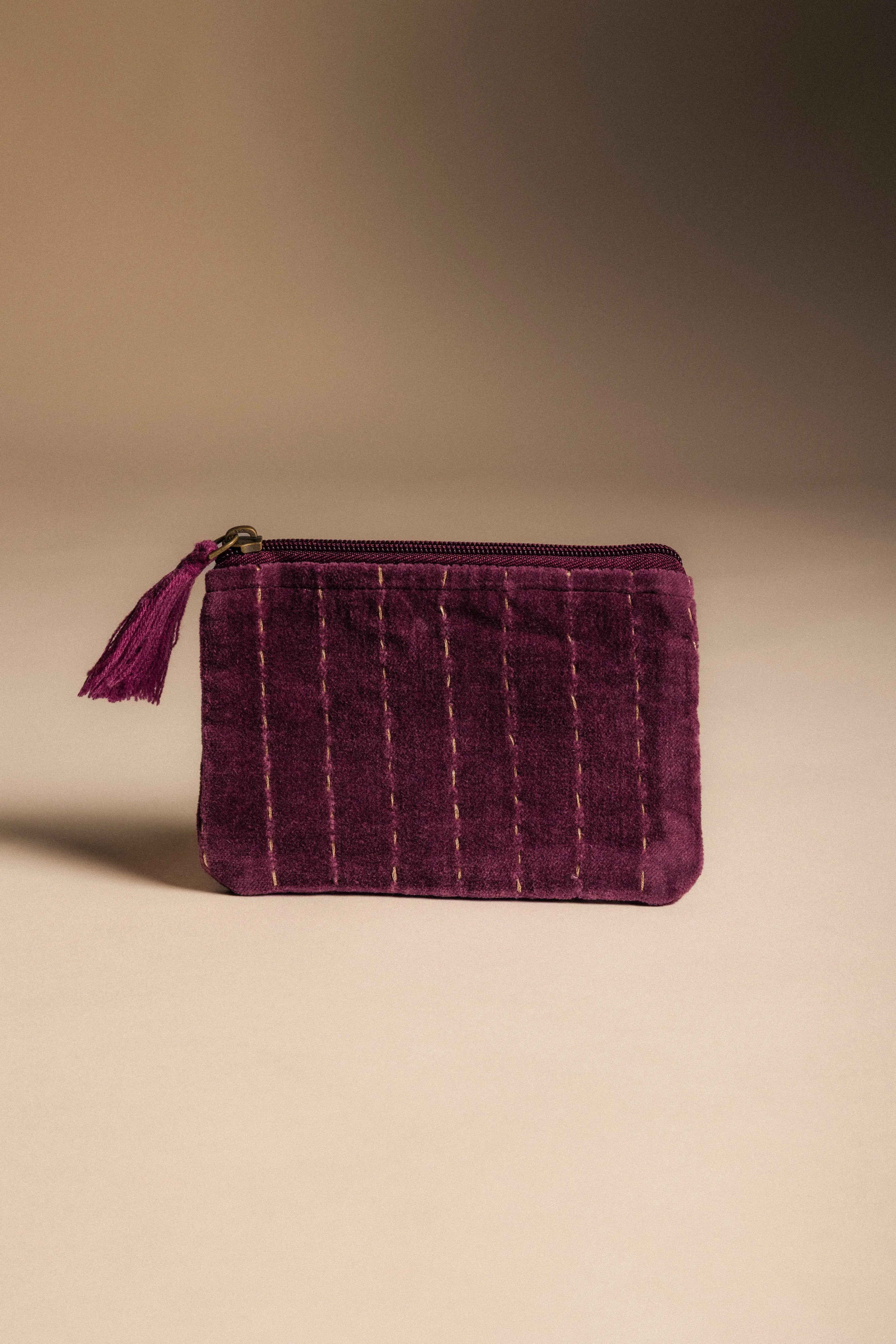 Monedero de terciopelo con estampado bordado. Cierre superior con cremallera y pompón decorativo.