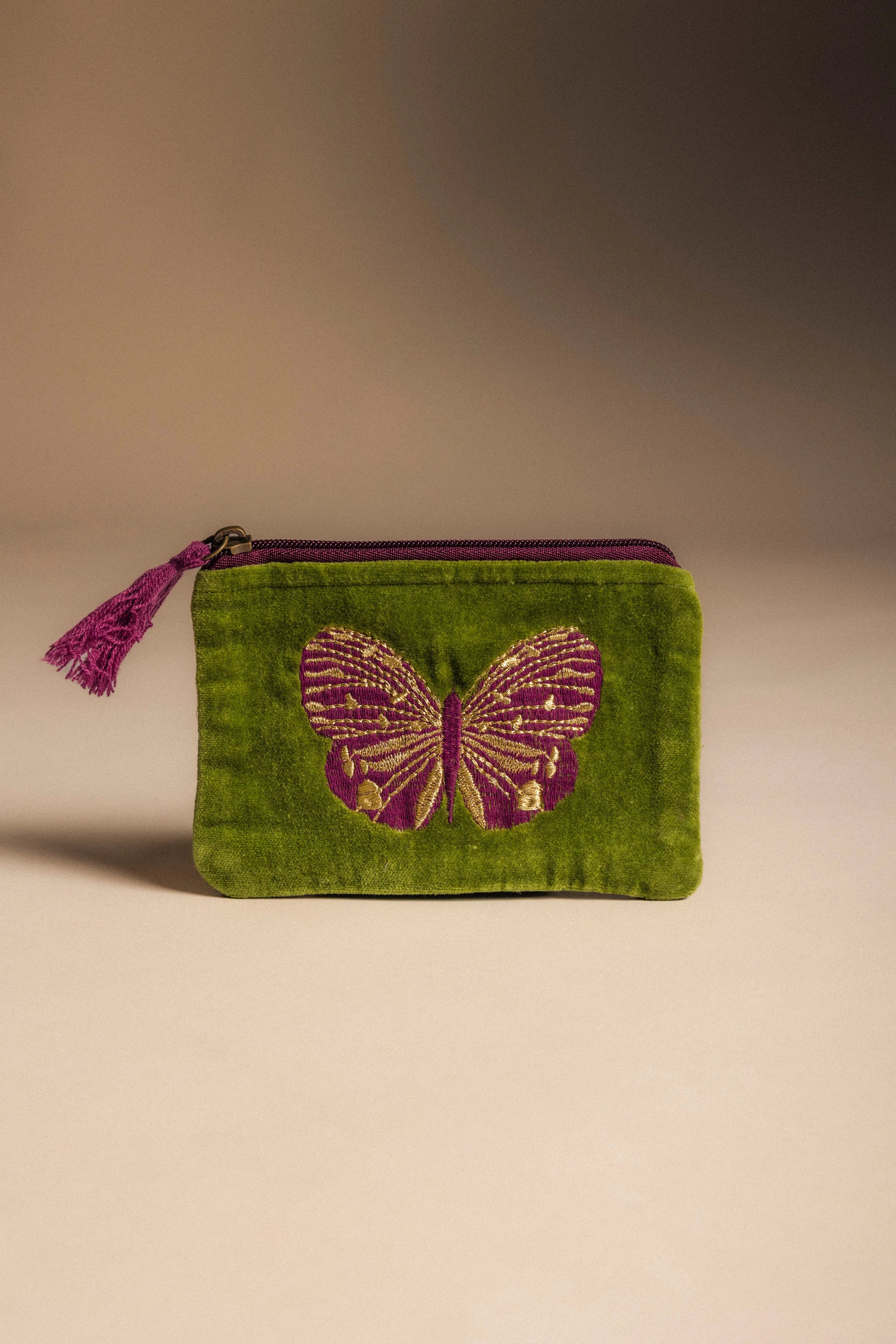 Monedero de terciopelo con estampado bordado. Cierre superior con cremallera y pompón decorativo.