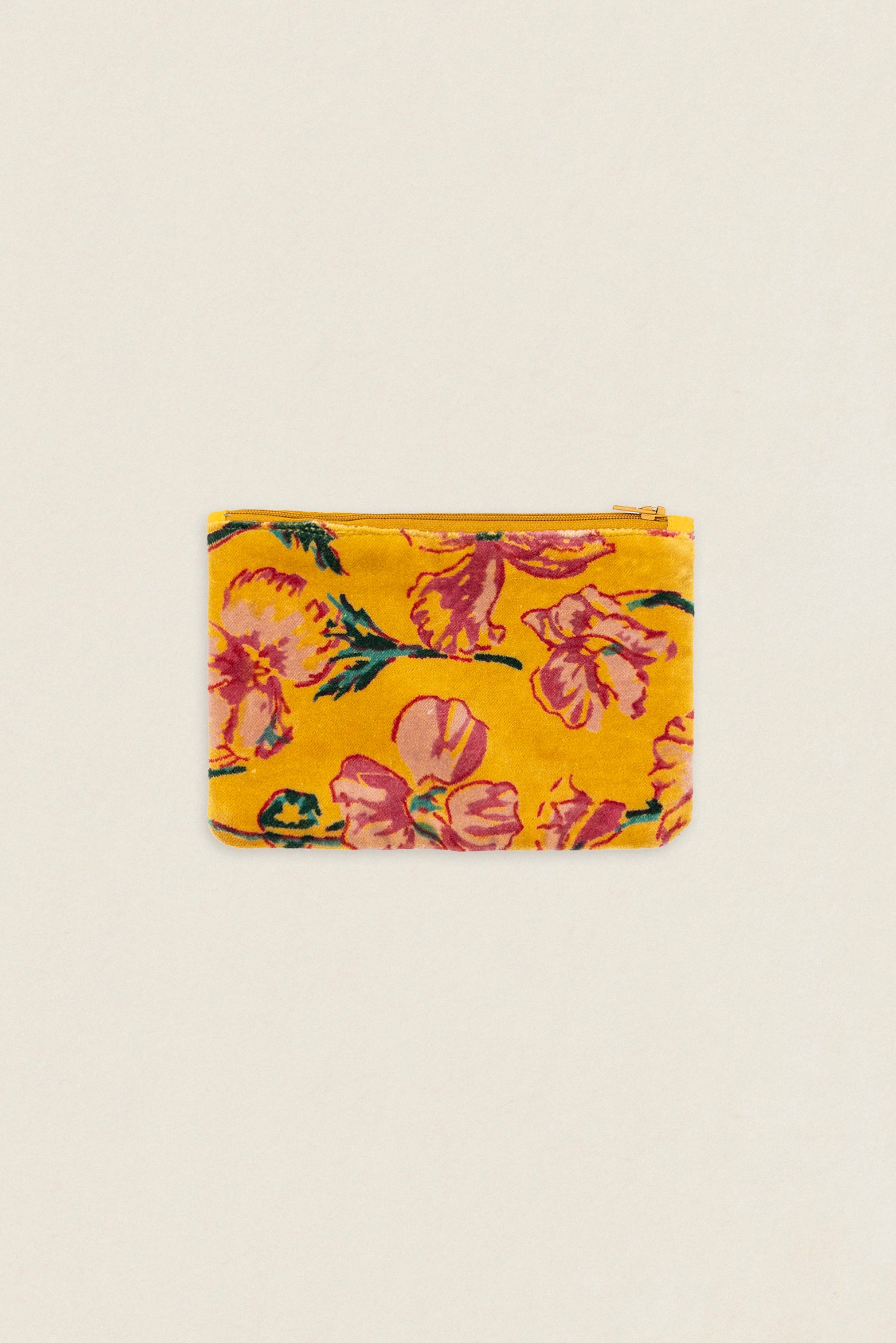 Monedero de terciopelo con estampado bordado. Cierre superior con cremallera y pompón decorativo.