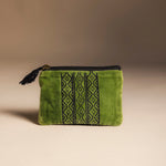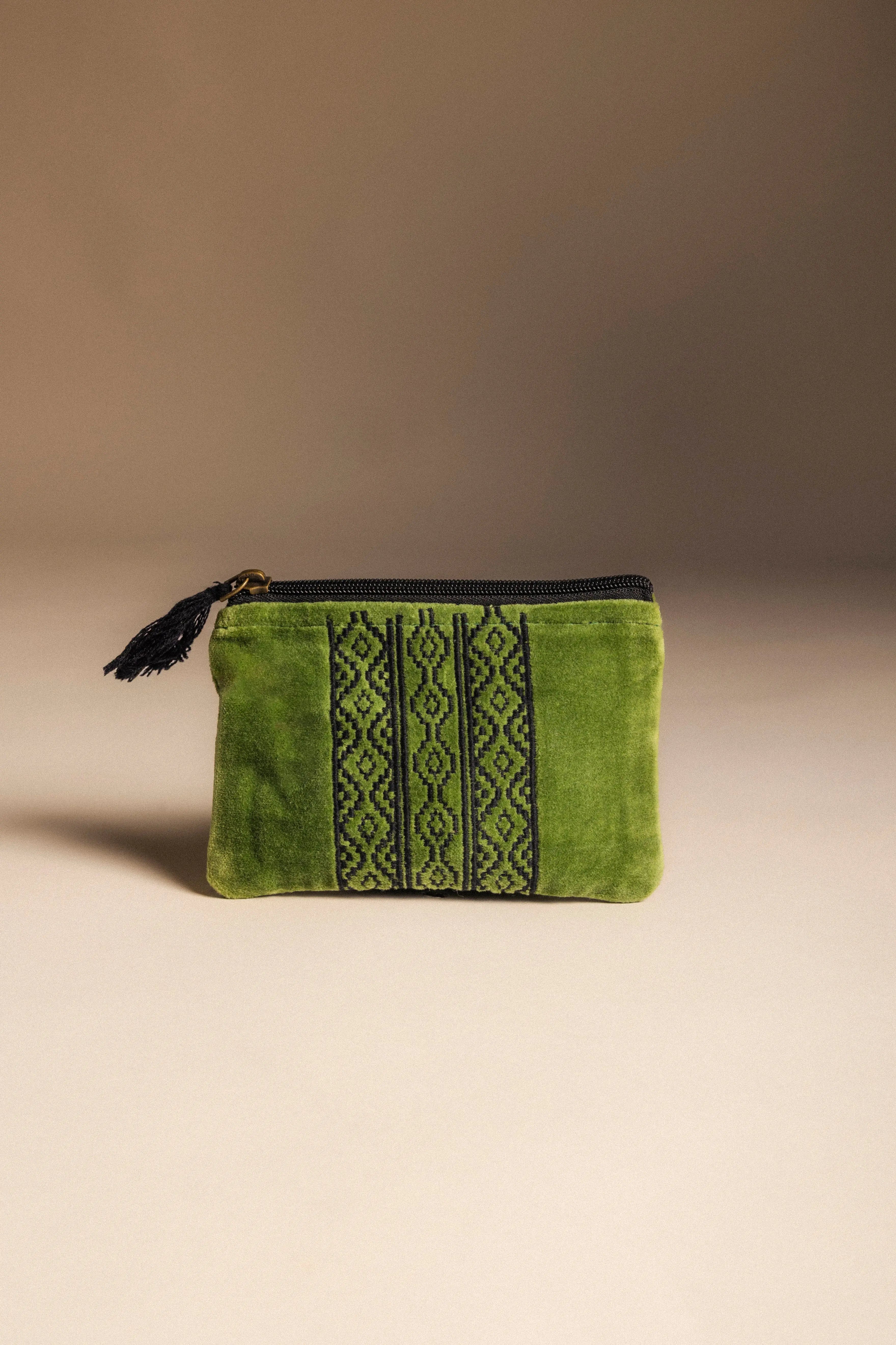 Monedero de terciopelo con estampado bordado. Cierre superior con cremallera y pompón decorativo.