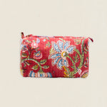 Neceser de algodón estampado con forro interior plastificado con 4 bolsillos interiores. Cierre superior con cremallera.