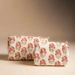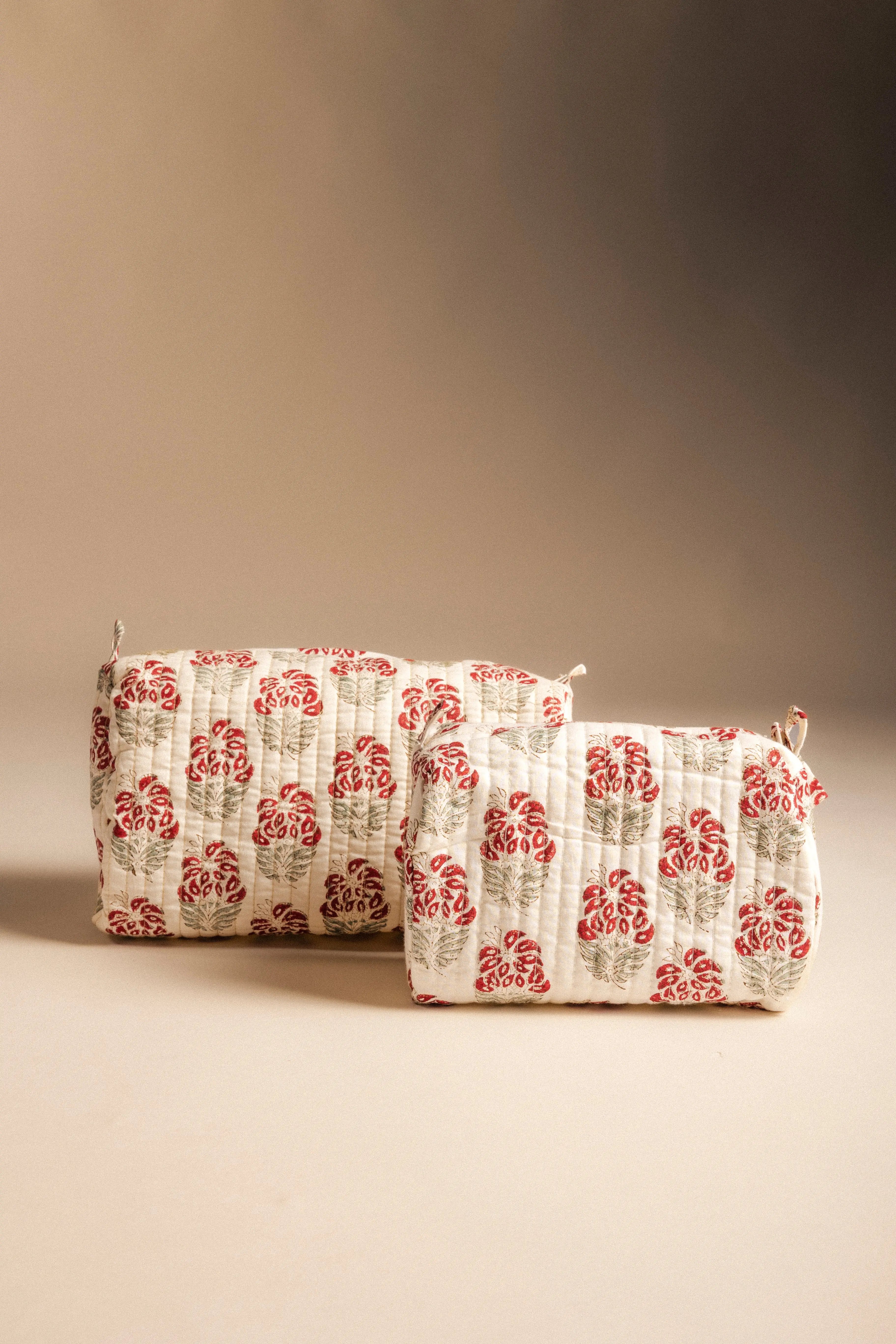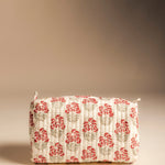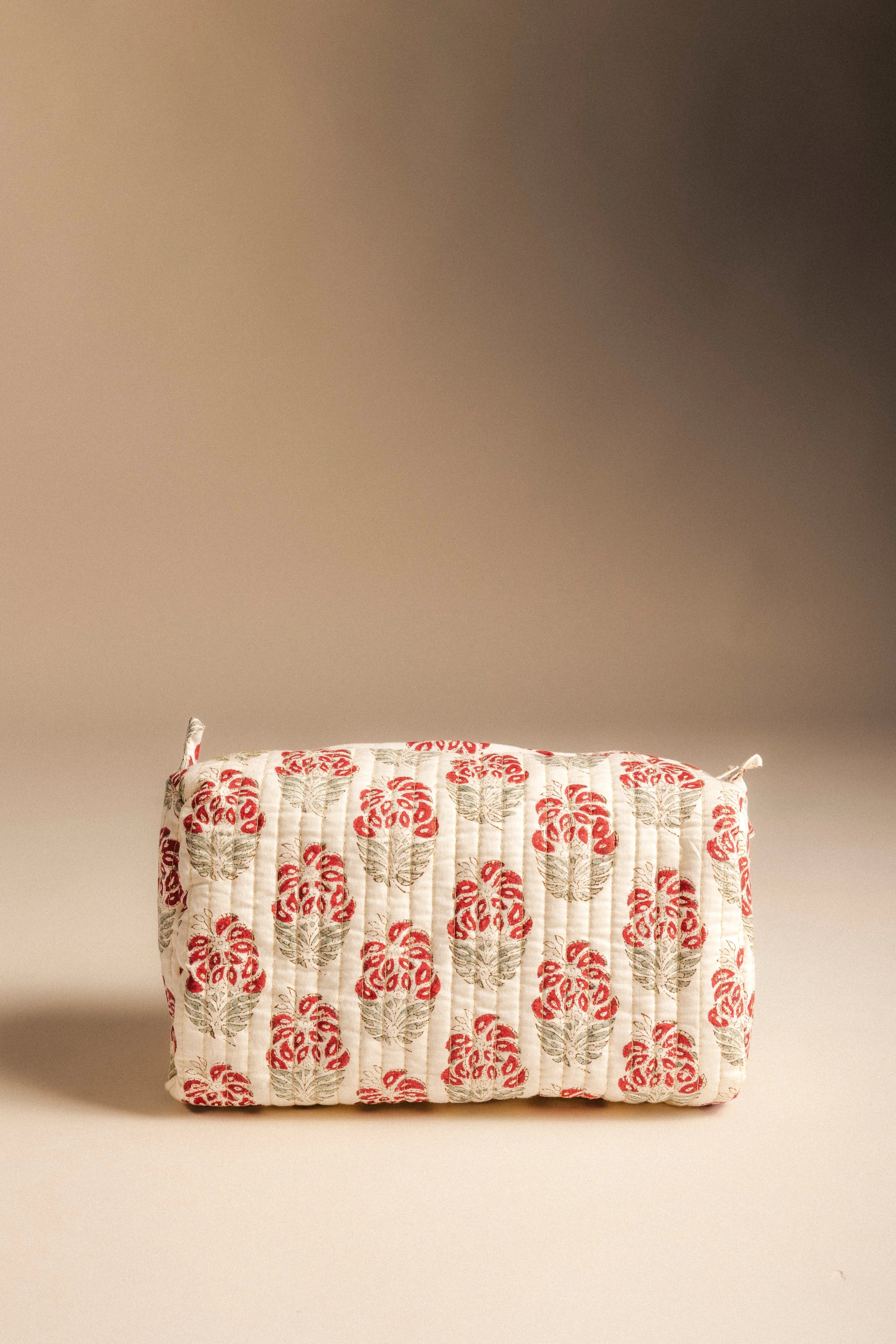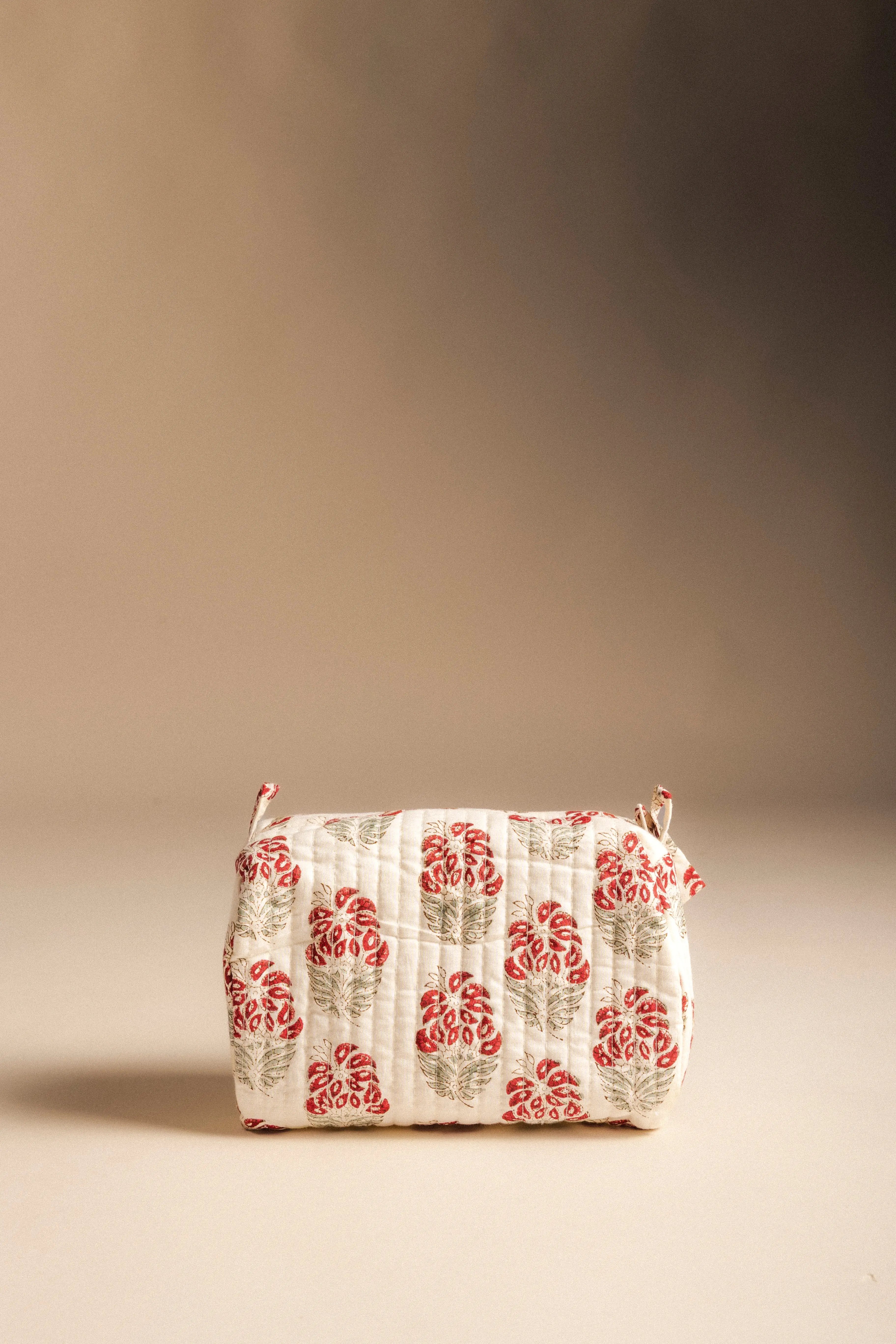 Neceser de algodón estampado con forro interior plastificado con 4 bolsillos interiores. Cierre superior con cremallera.