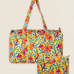 Neceser de algodón estampado con forro interior plastificado con 4 bolsillos interiores. Cierre superior con cremallera.