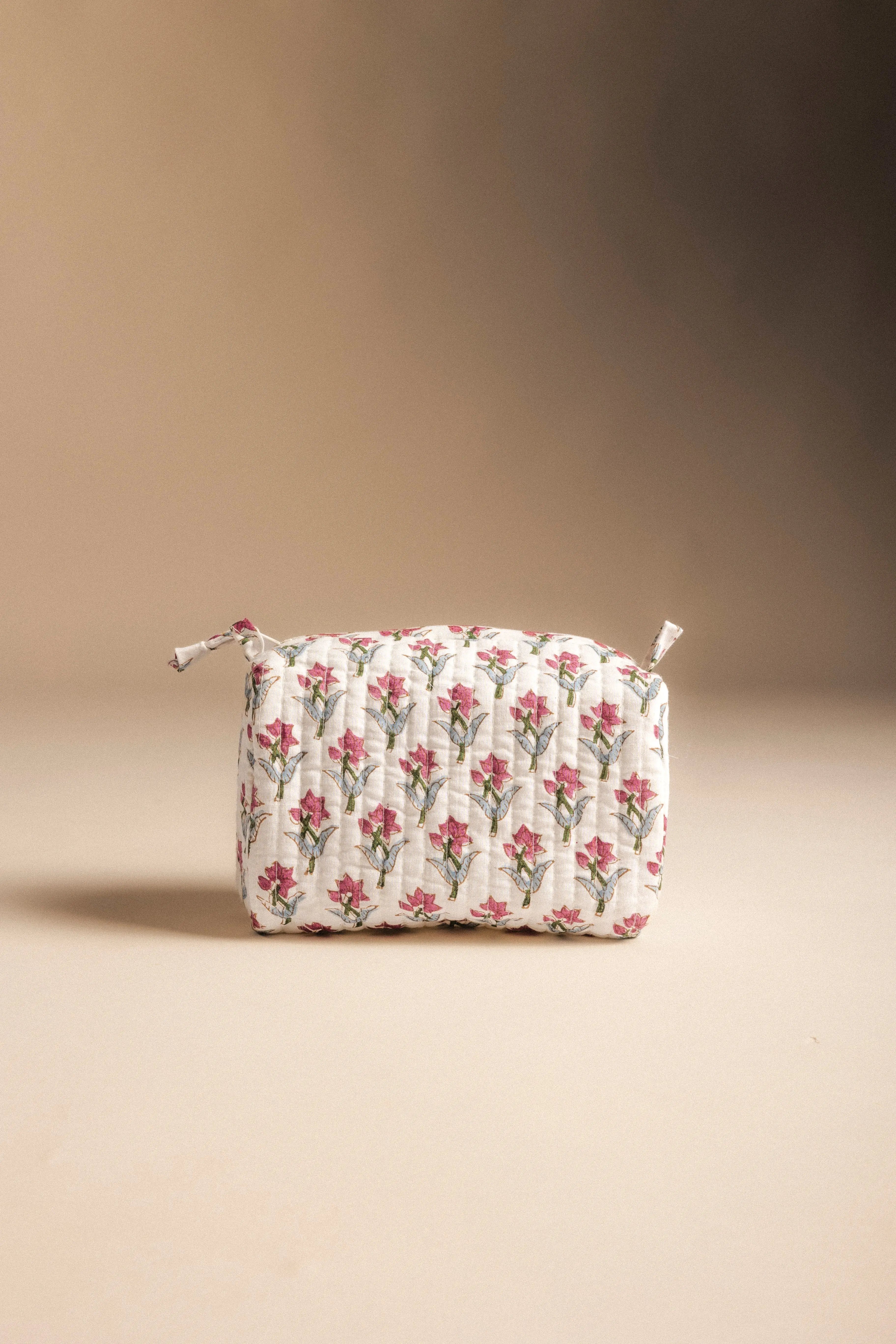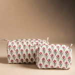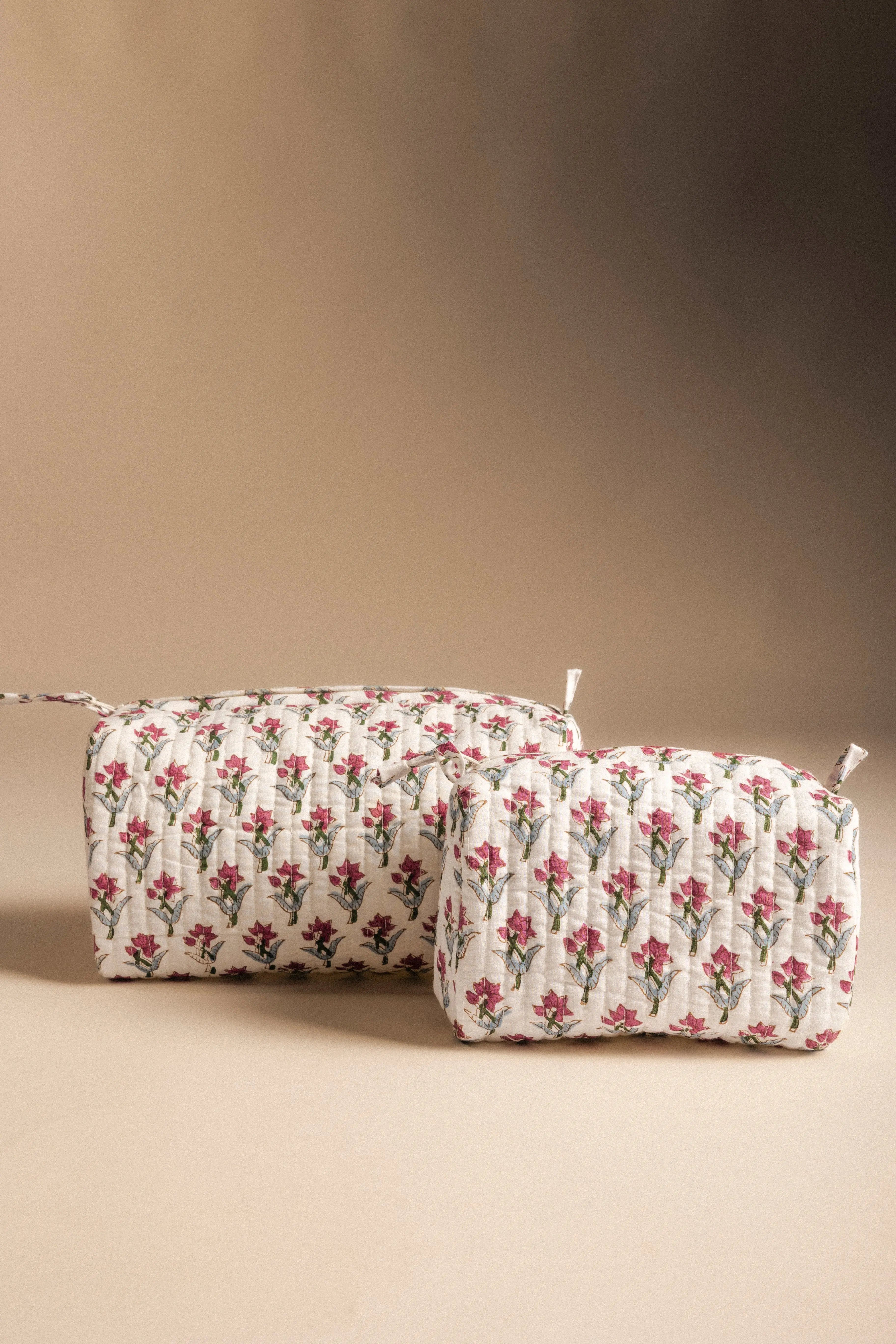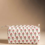 Neceser de algodón estampado con forro interior plastificado con 4 bolsillos interiores. Cierre superior con cremallera.