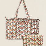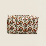 Neceser de algodón estampado con forro interior plastificado con 4 bolsillos interiores. Cierre superior con cremallera.