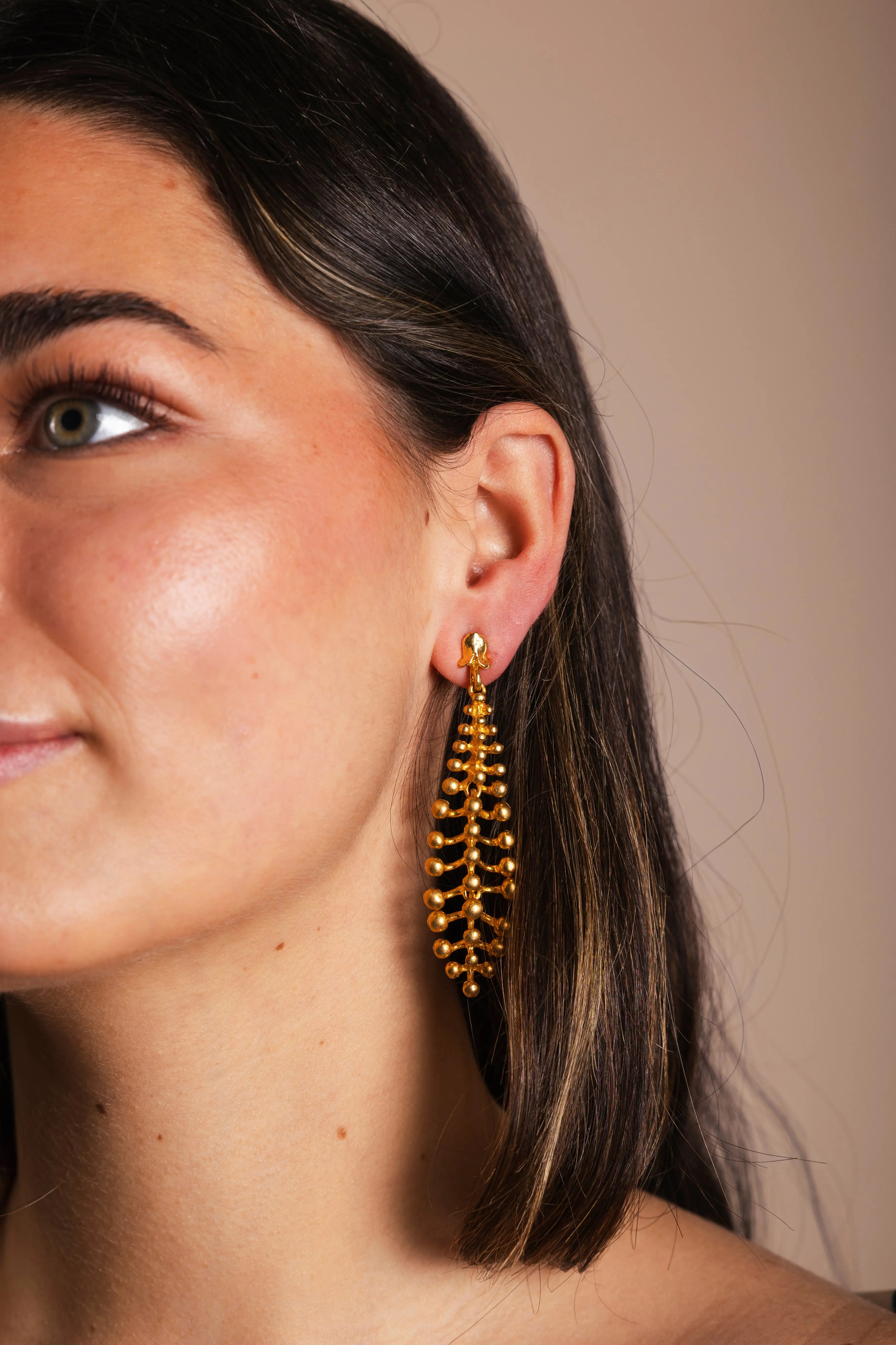 Su estructura combina un eje central estilizado del que nacen múltiples bolitas doradas, creando un efecto de abanico vertical que aporta volumen y un juego de luces sutil al moverse. Con una longitud de 7,5 cm, estilizan el cuello y enmarcan el rostro con elegancia.