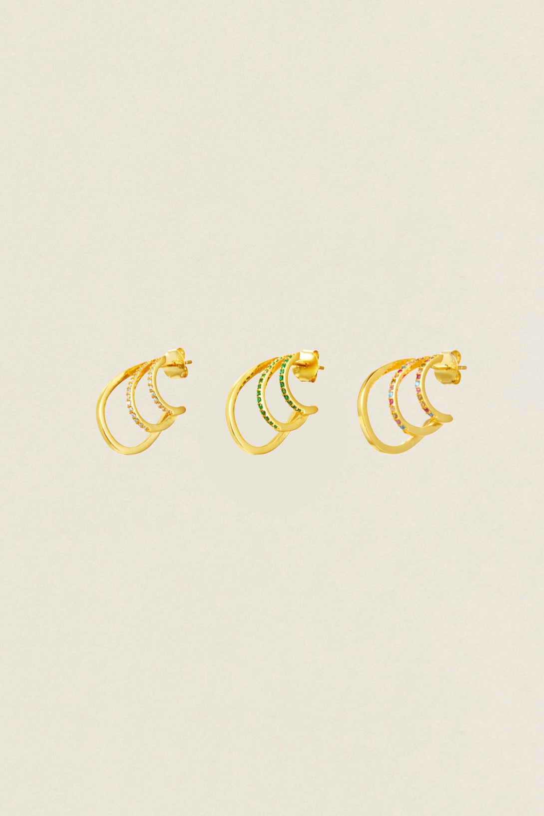 Los pendientes Aro Triple Circonitas están elaborados en Plata de Ley 925 con acabado en baño de oro de 18k, ofreciendo un brillo duradero y elegante.