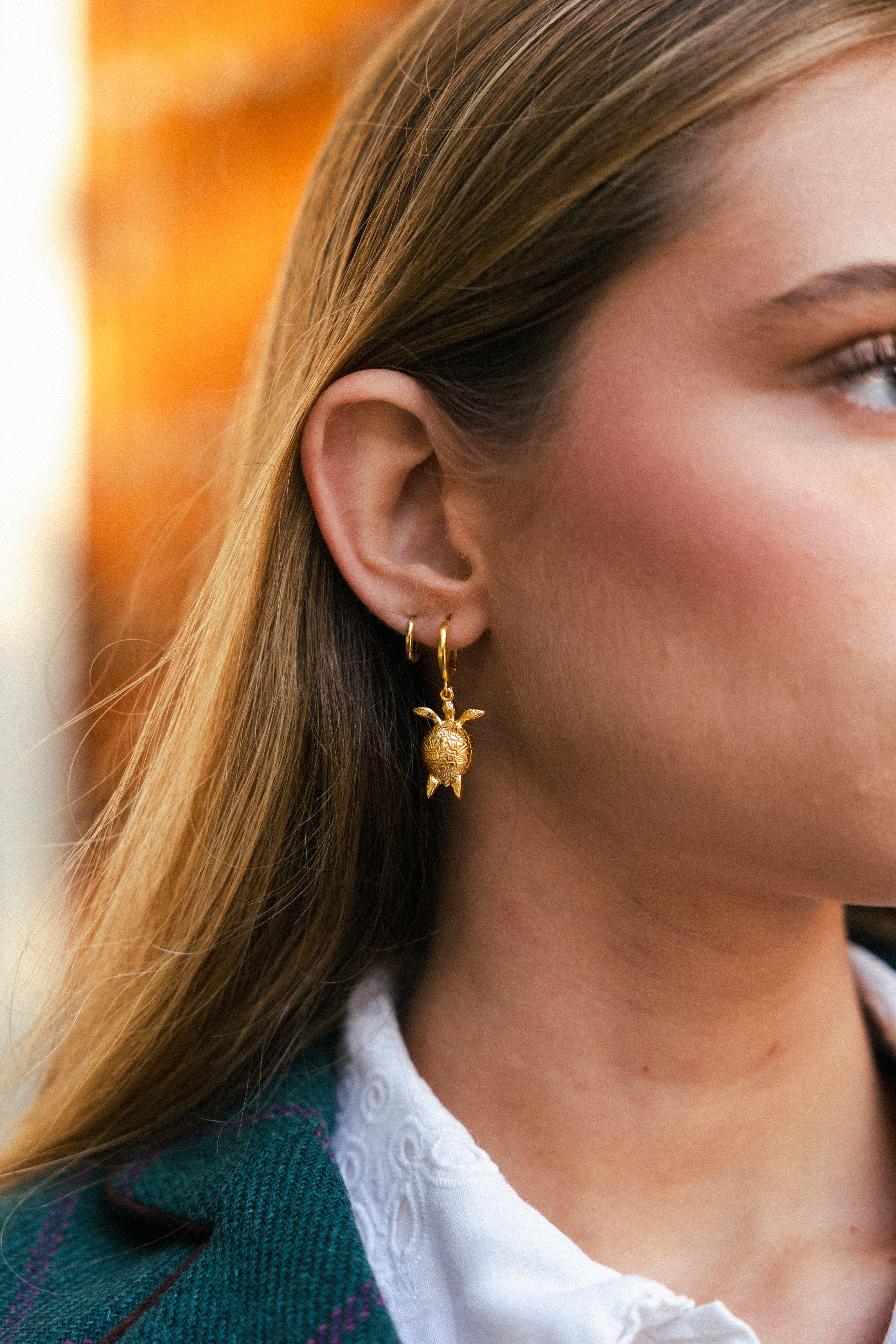Estos pendientes dorados combinan una argolla clásica con una delicada tortuga colgante, símbolo de protección y longevidad.