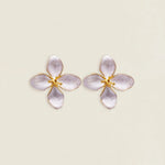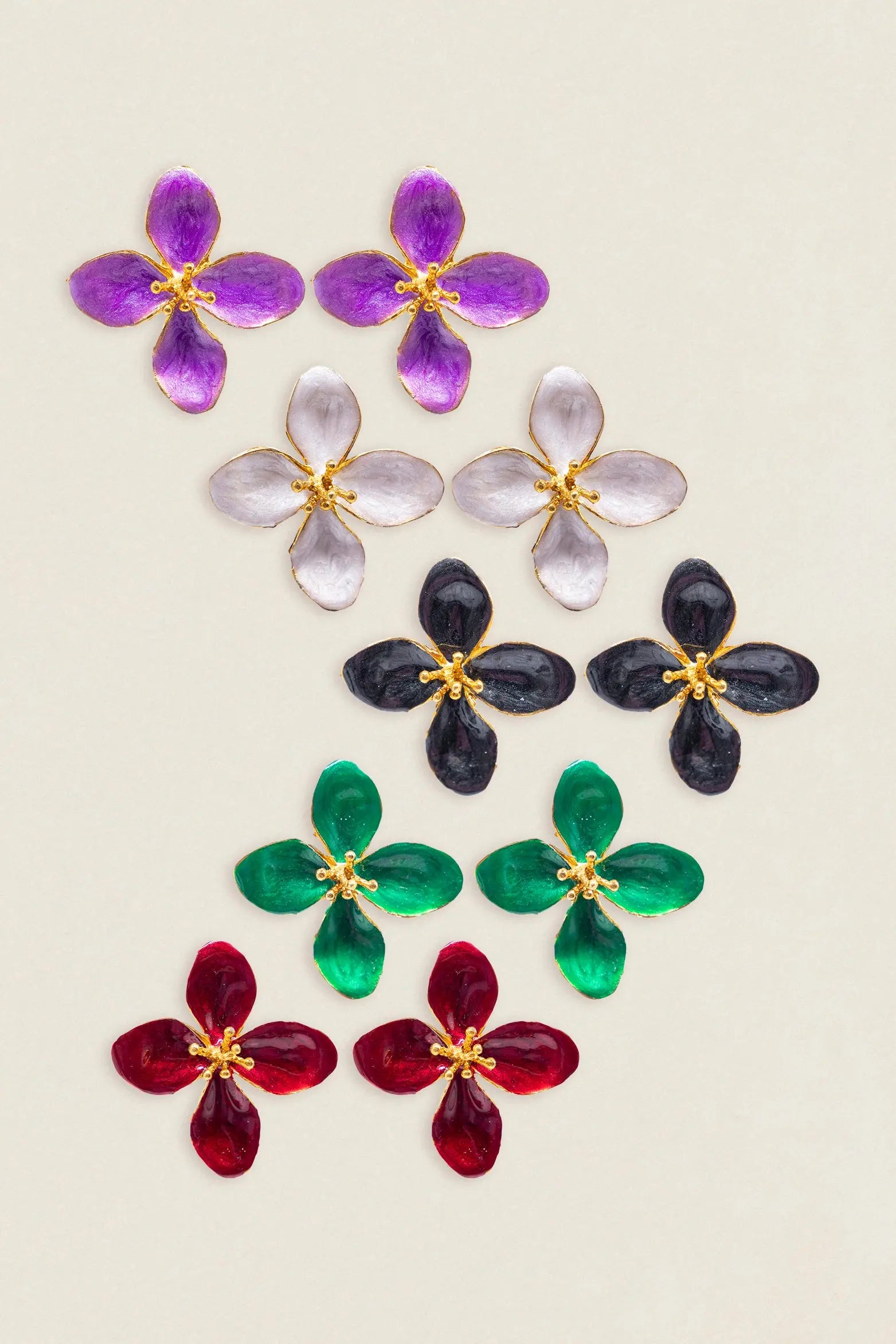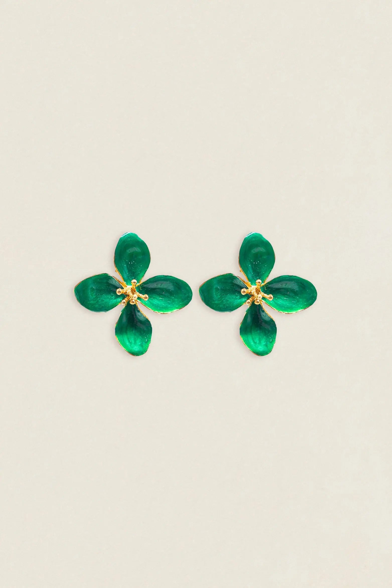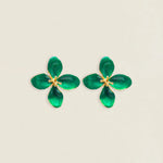 Los Pendientes Carmeron Flor 4 Pétalos PEN03 elaborados en bronce chapado en oro de 18k, presentan un delicado diseño de flor de 4 pétalos esmaltada en tonos vibrantes, creando una composición luminosa y llena de vida.