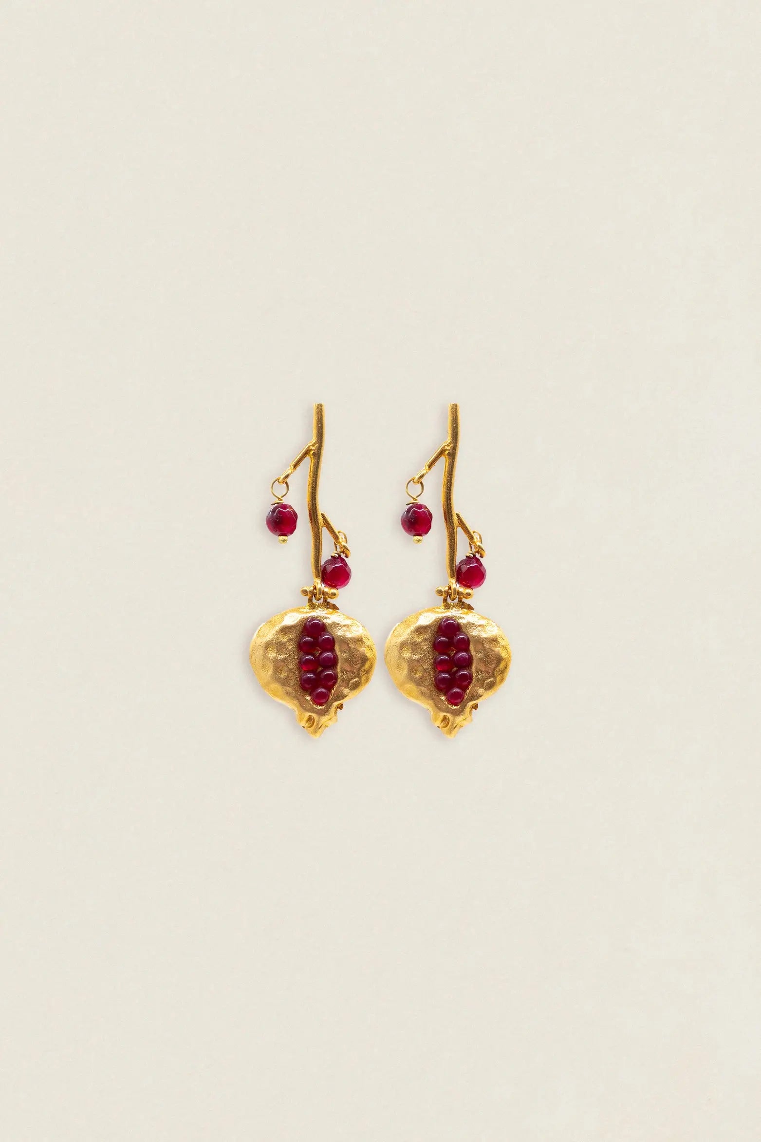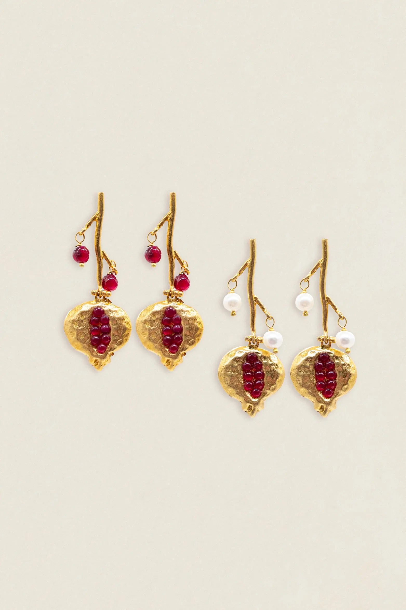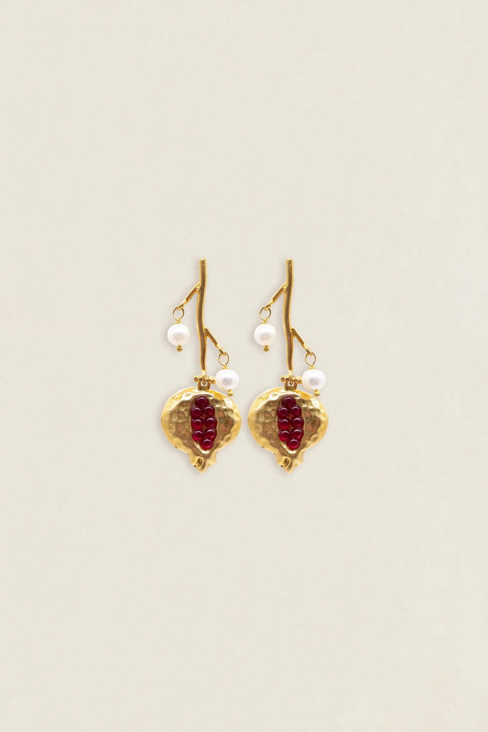 Pendiente de bronce chapado en oro de 18 kilates, elaborado a mano por nuestros artesanos. Granada con piedras minerales en su interior y perlas en el palo superior que la sujeta.