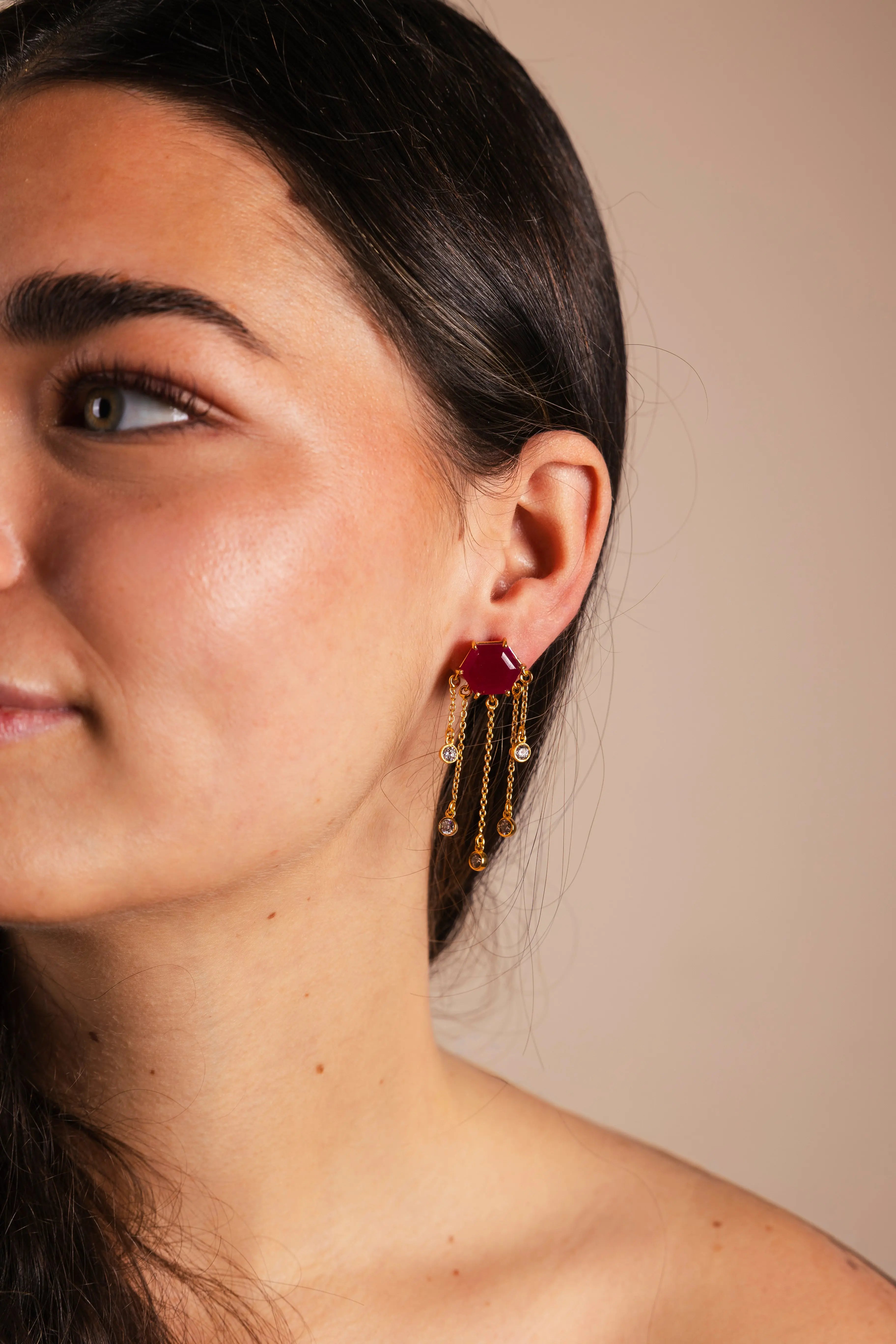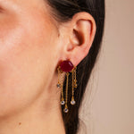 Los Pendientes Hexa Stone PEN119 destacan por su diseño moderno y lleno de carácter. Su forma hexagonal, cuidadosamente trabajada, enmarca una piedra central disponible en diferentes colores, creando un contraste elegante entre geometría y brillo. De la base hexagonal cuelgan finas cadenas doradas adornadas con circonitas, que aportan movimiento y destellos de luz a cada paso.