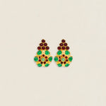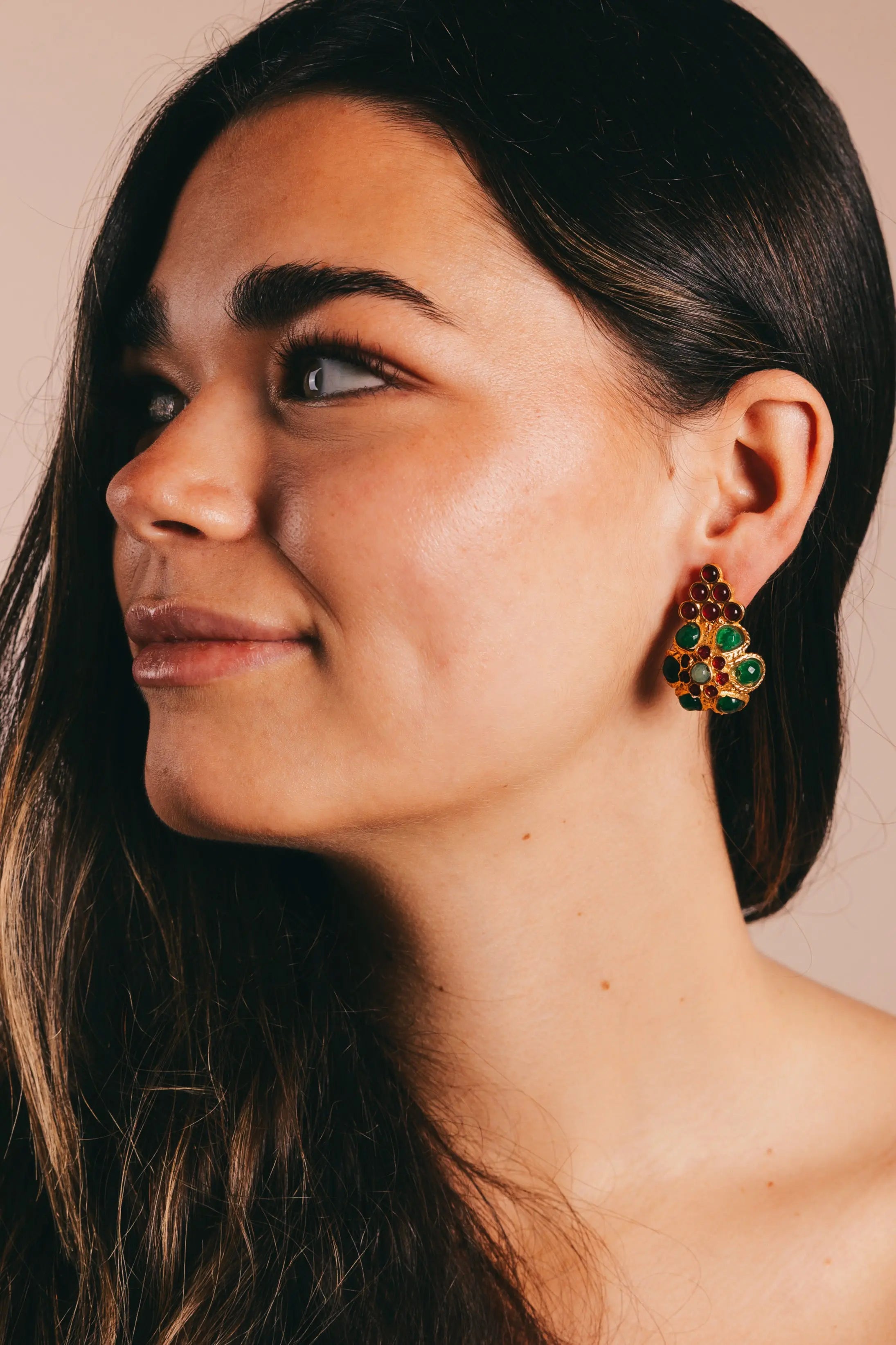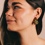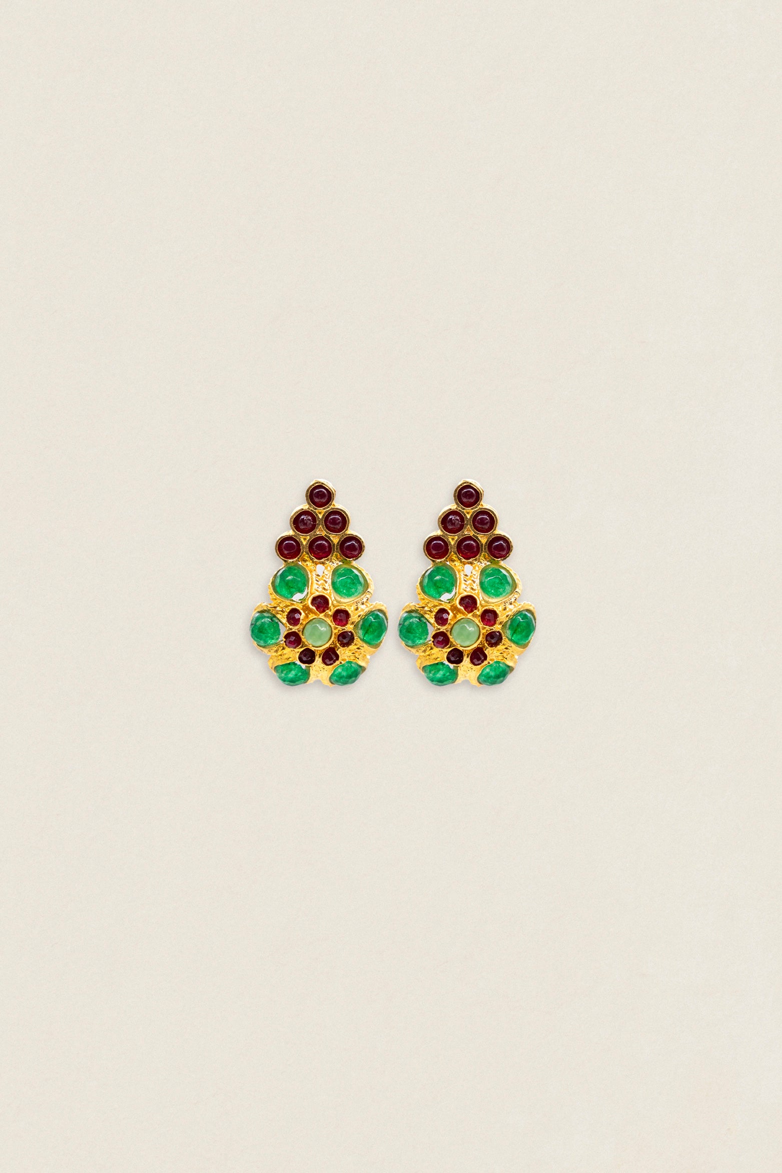 Cada pendiente combina piedras minerales en tonos verdes y burdeos, cuidadosamente engarzadas a mano, creando una pieza vibrante y llena de vida.