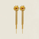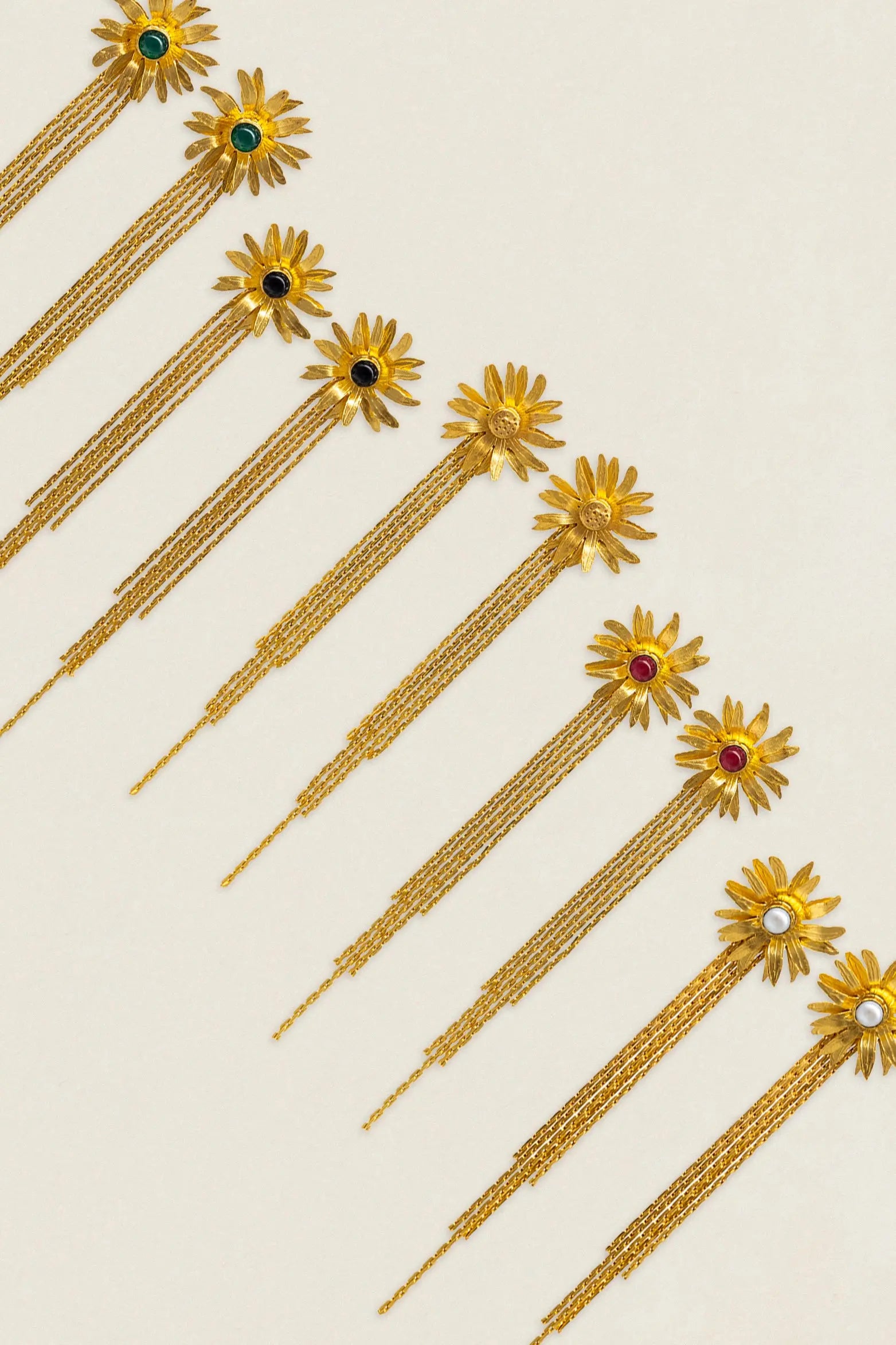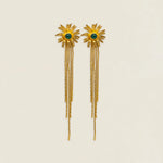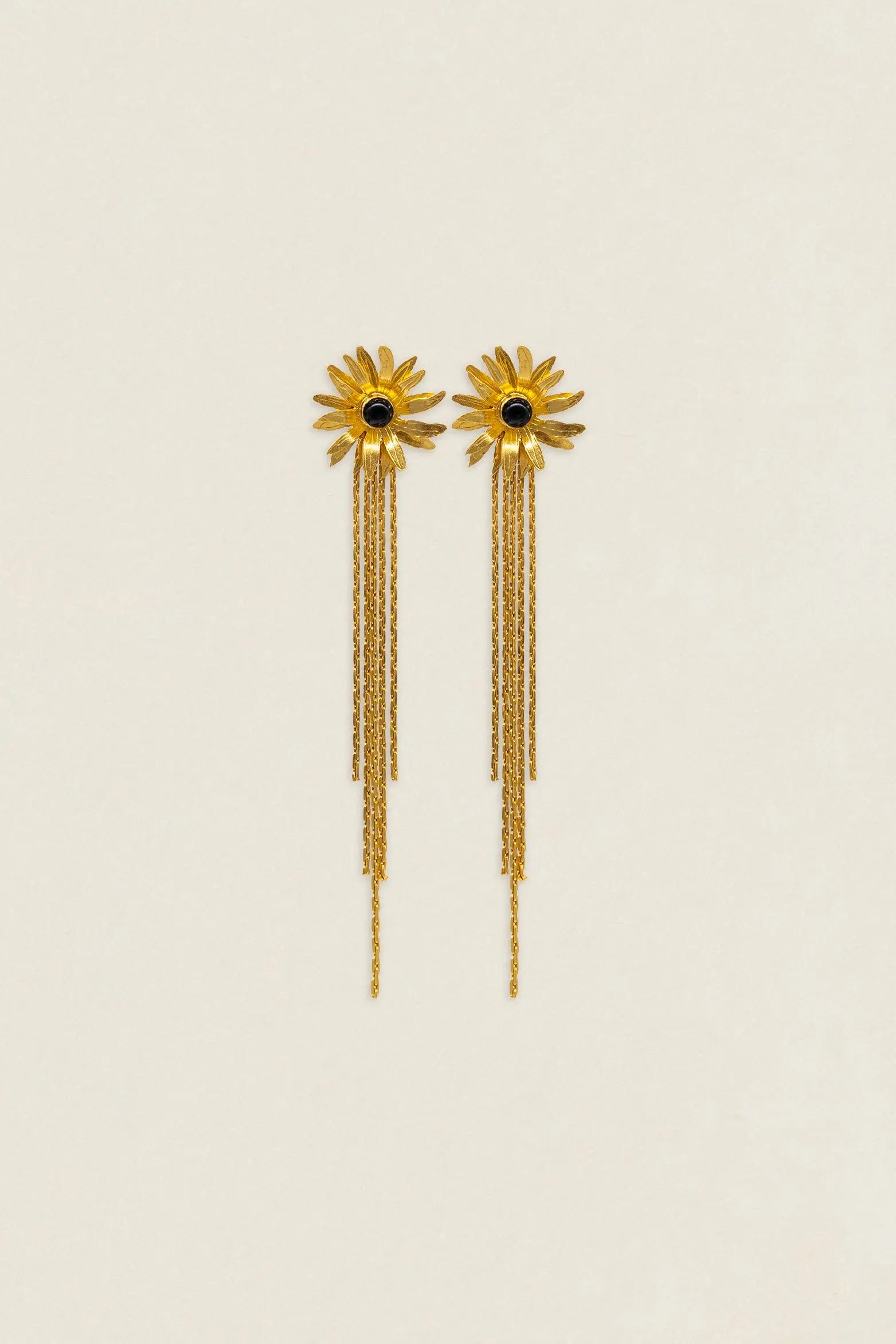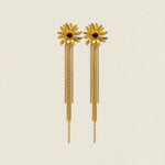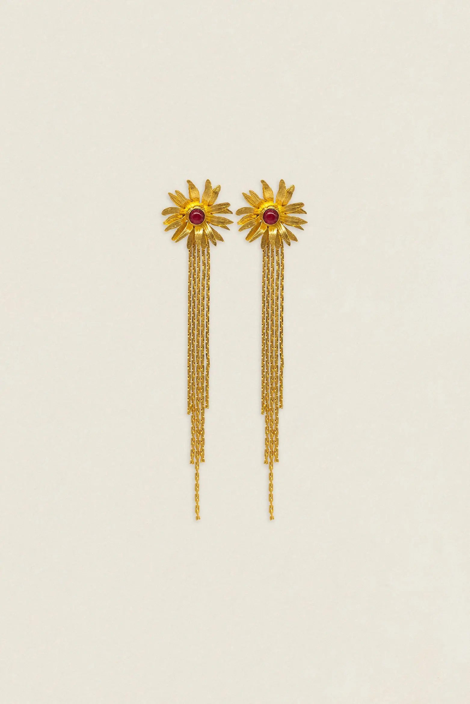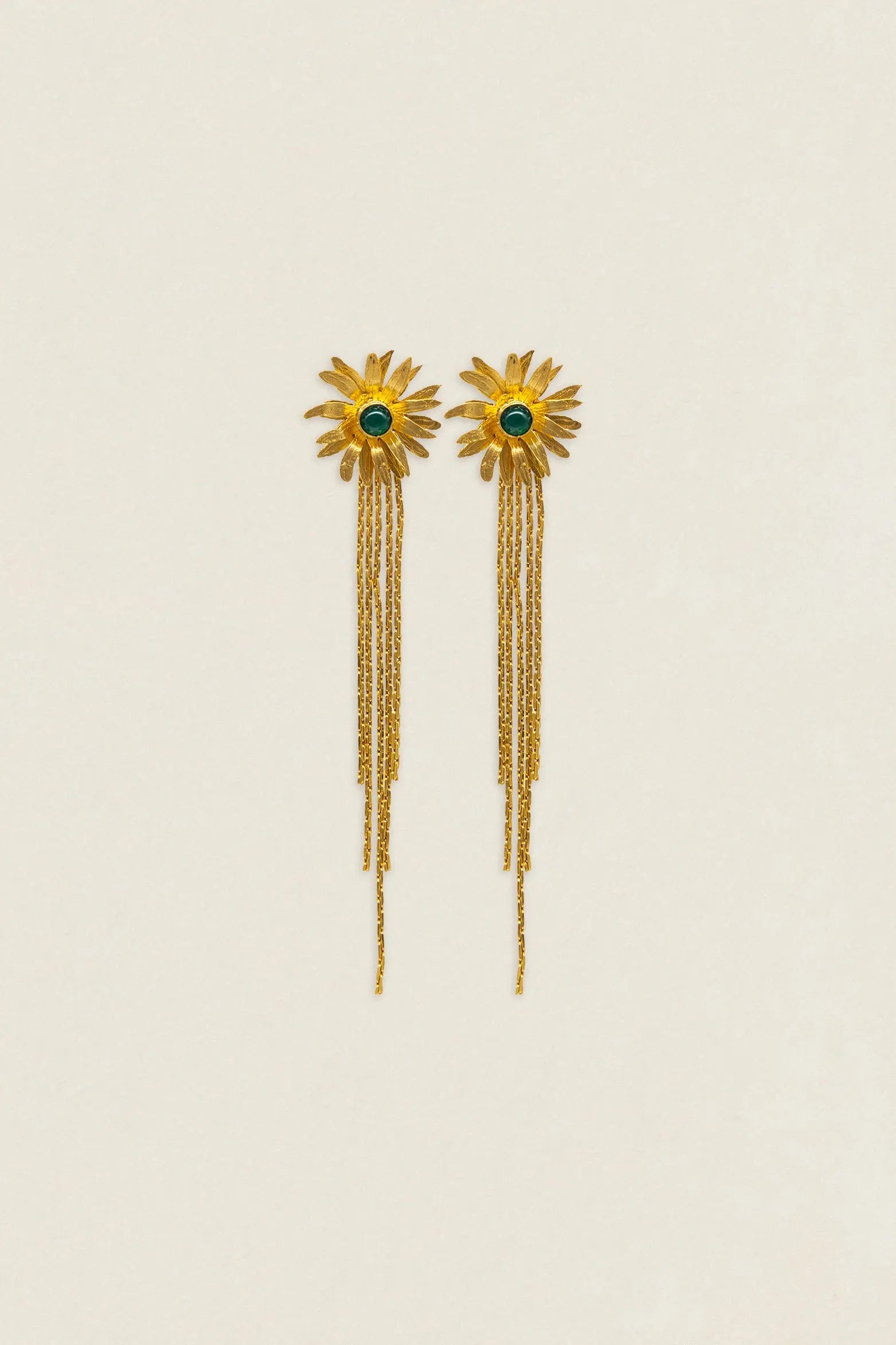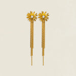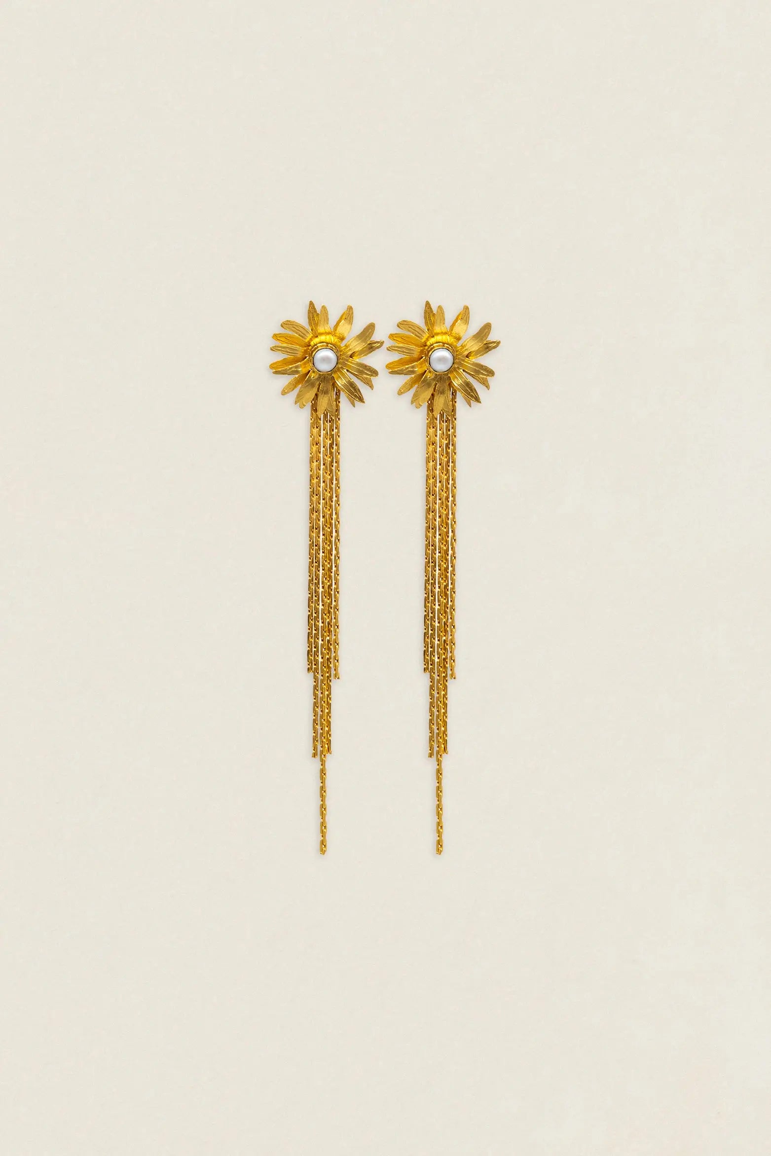 Los Pendientes Marga PEN37 son una pieza de joyería elegante y sofisticada que combina el encanto floral con un movimiento sutil y moderno. Su diseño presenta una flor dorada en el lóbulo, de la cual cuelgan finas tiras de cadena que se balancean delicadamente, creando un efecto luminoso y lleno de dinamismo.