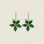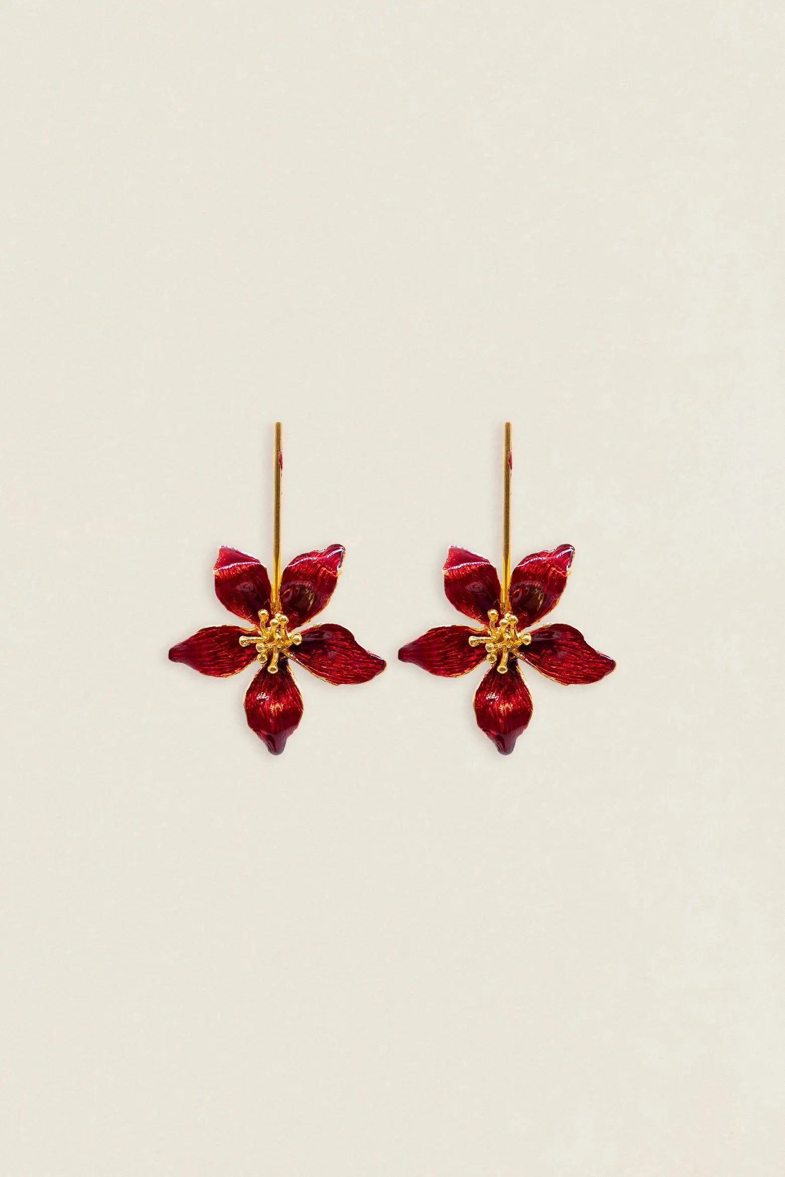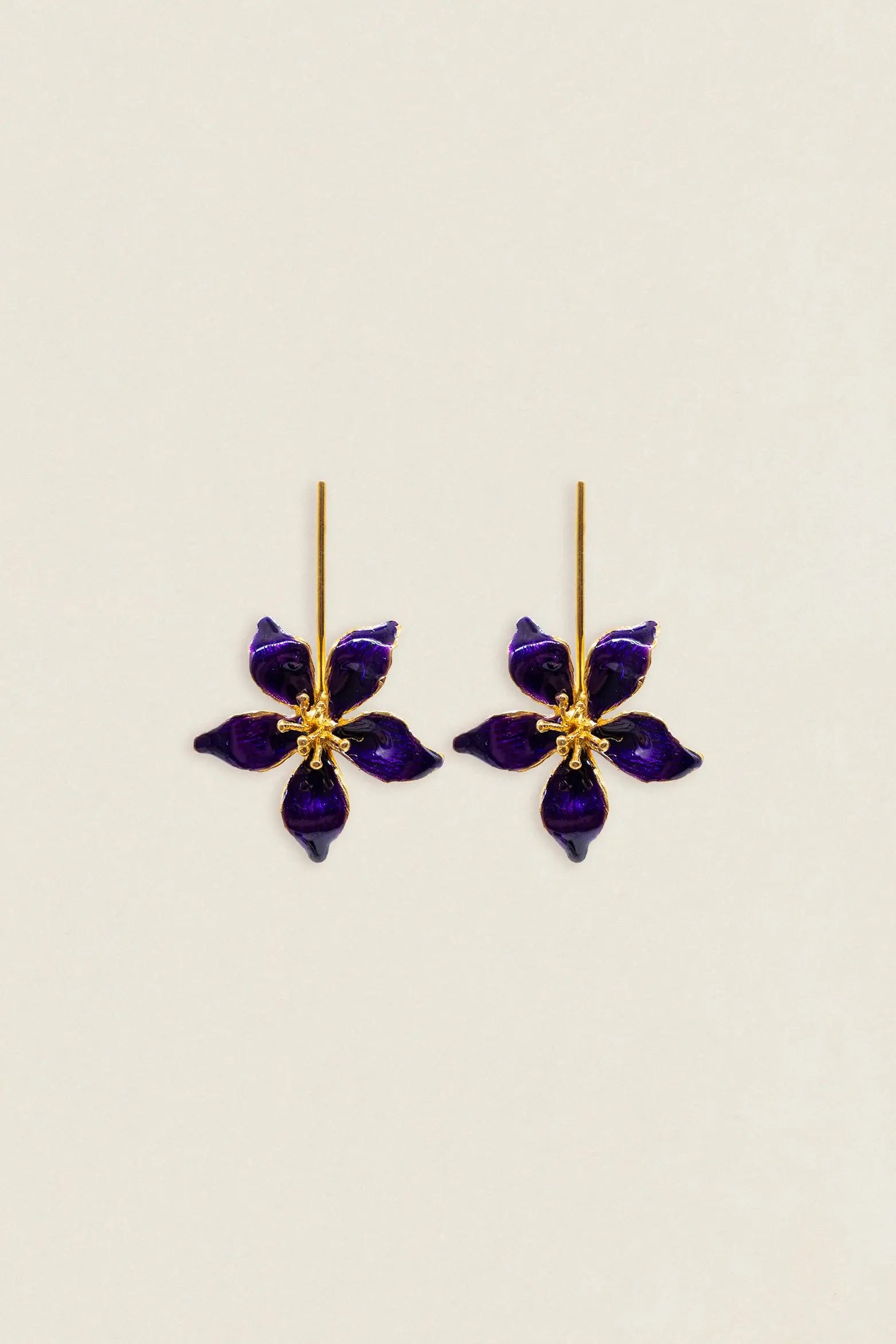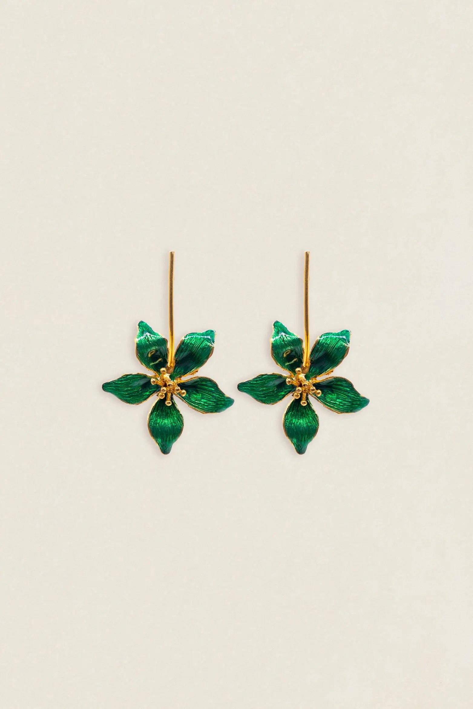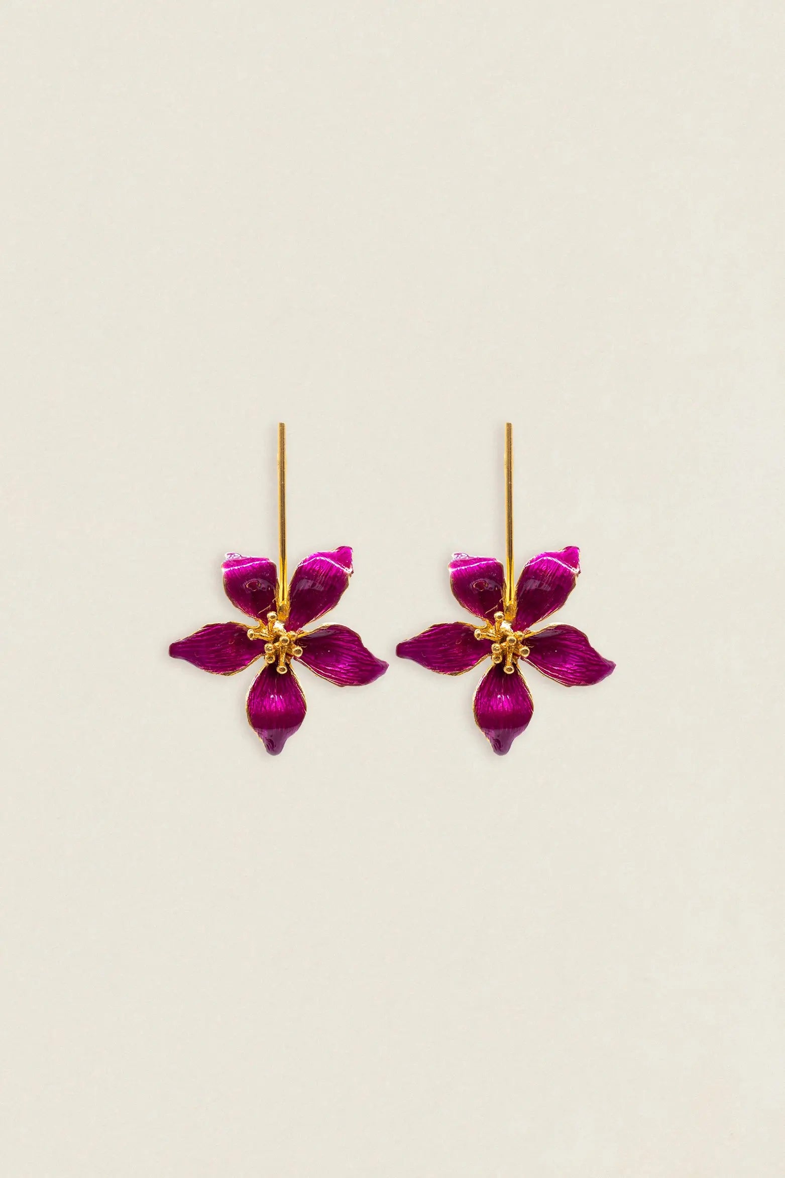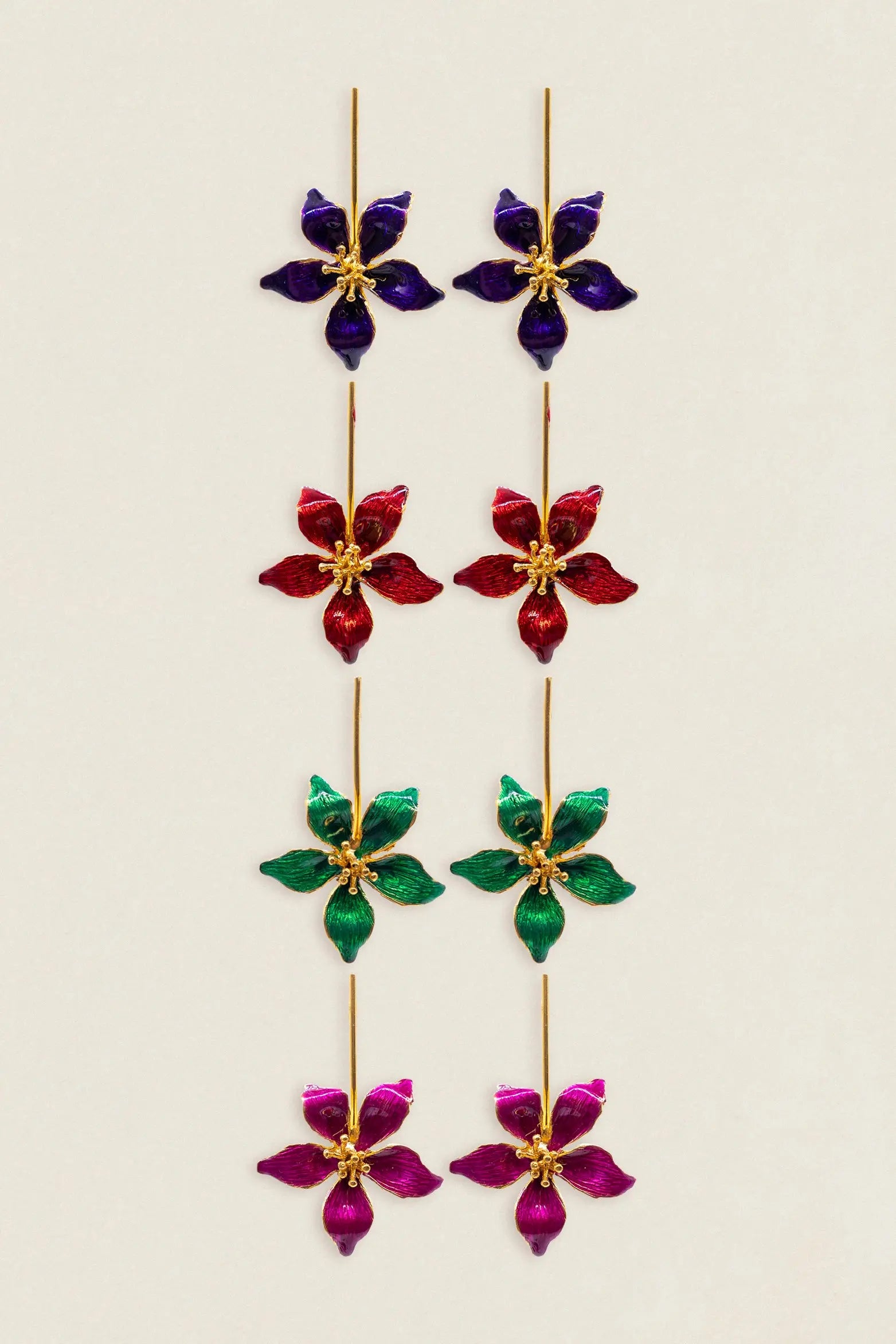 Pendientes colgantes fabricados en bronce chapado en oro, diseñados para aportar un toque elegante y femenino a cualquier conjunto. Su delicado diseño combina una flor esmaltada en color en la parte superior con un stick que la sujeta.