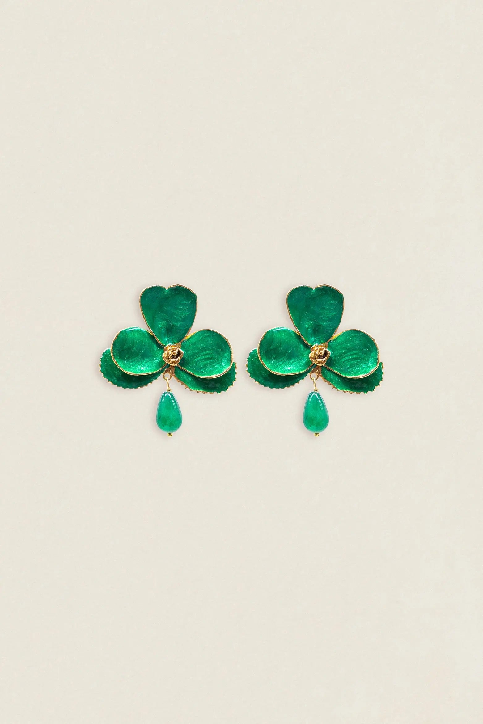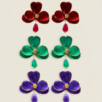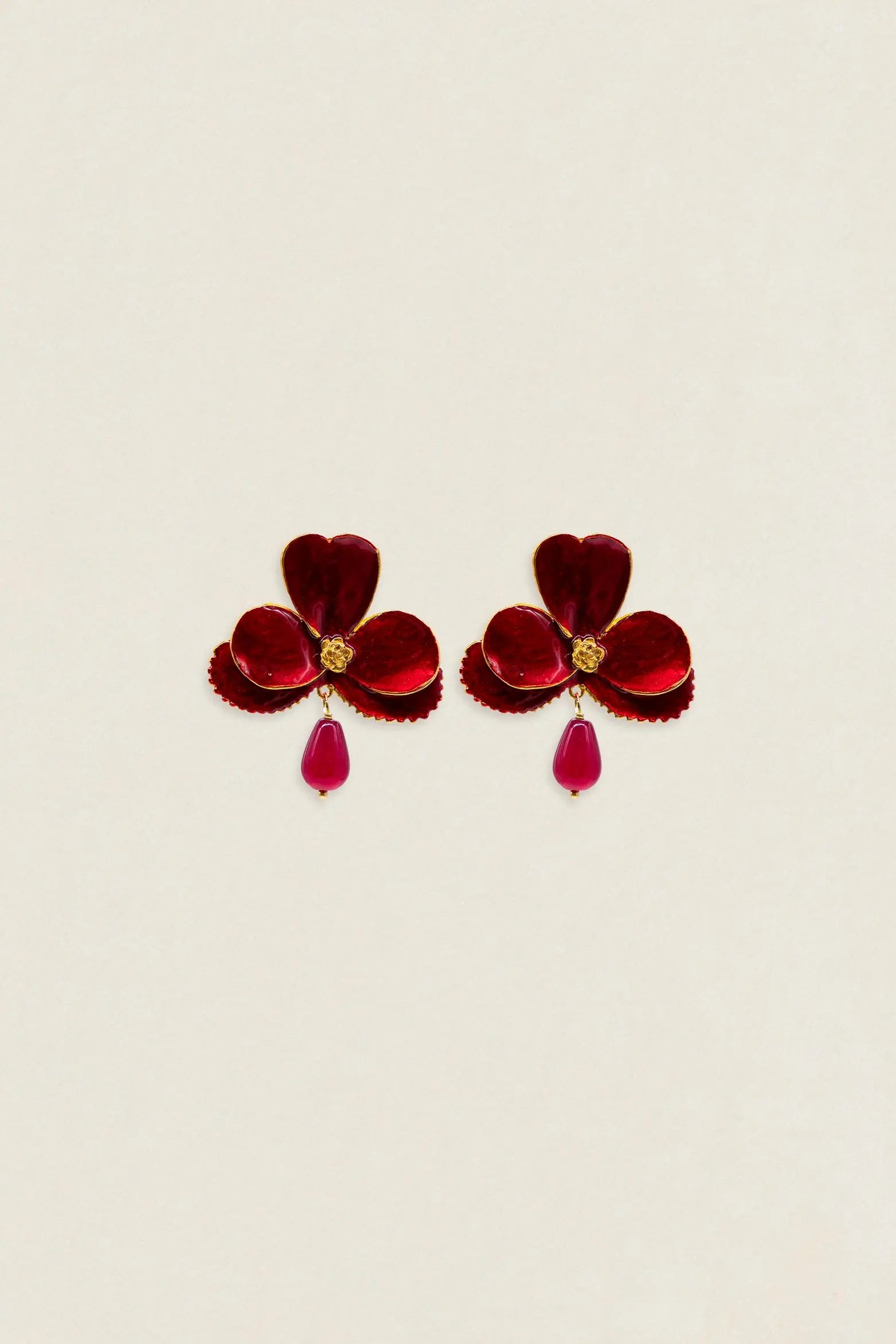 Pendientes colgantes fabricados en bronce chapado en oro, diseñados para aportar un toque elegante y femenino a cualquier conjunto. Su delicado diseño combina una flor esmaltada en color en la parte superior con una lágrima colgante, creando un contraste sofisticado y lleno de personalidad.