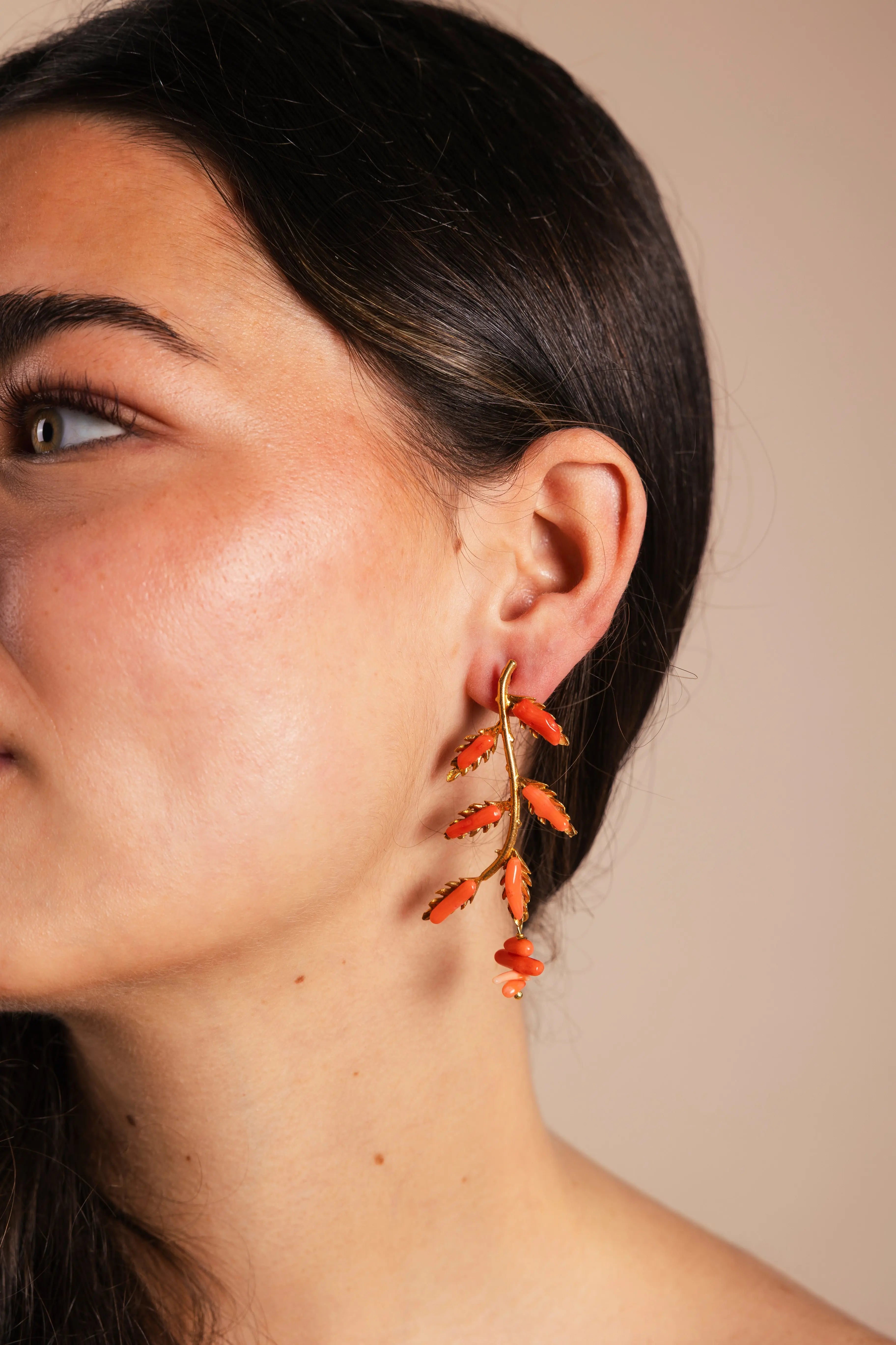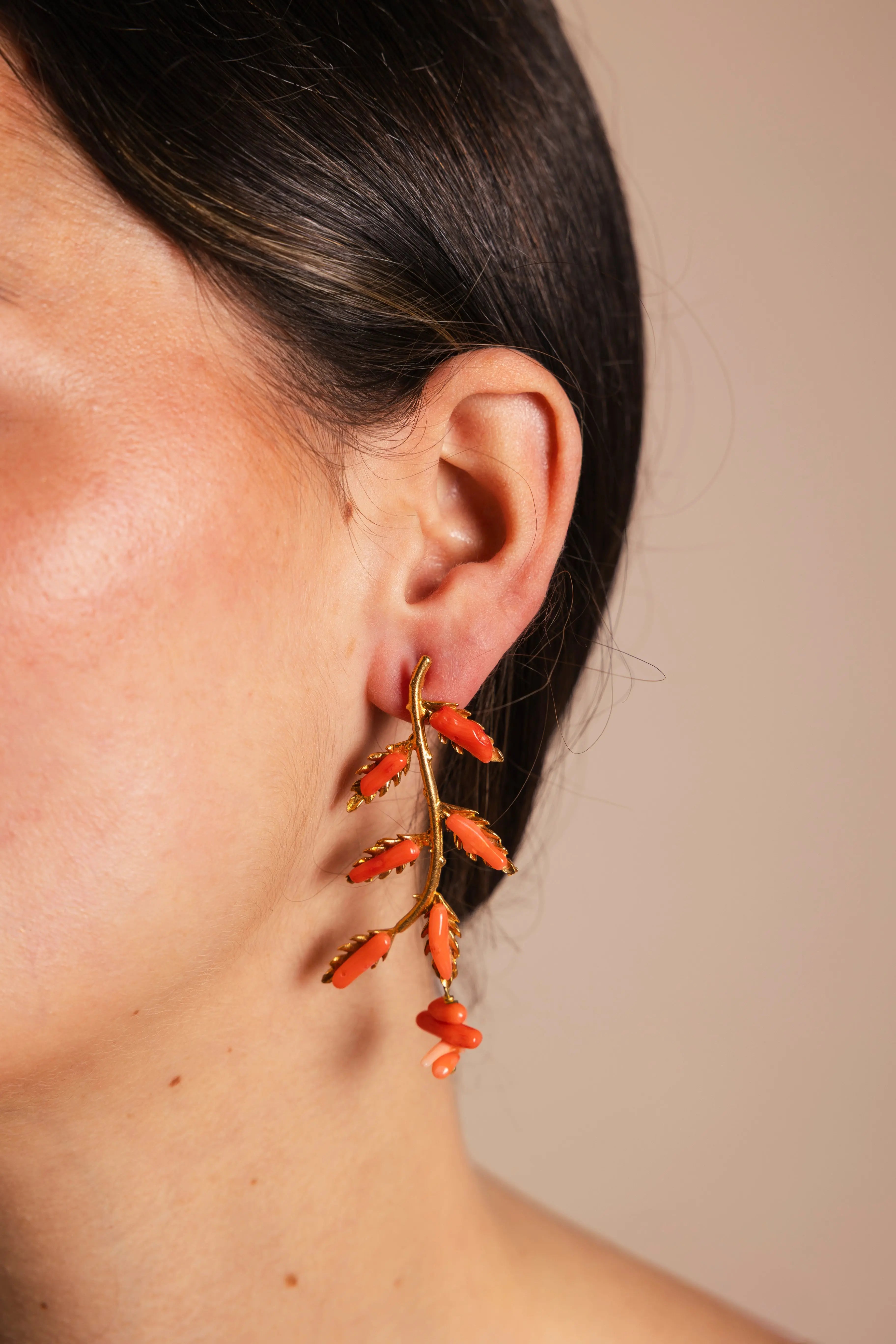 Su delicada estructura en forma de rama se adorna con pequeñas piedras minerales de coral colocadas en cada hoja, creando un contraste armónico entre el dorado y los tonos coral que ilumina el rostro con suavidad.
