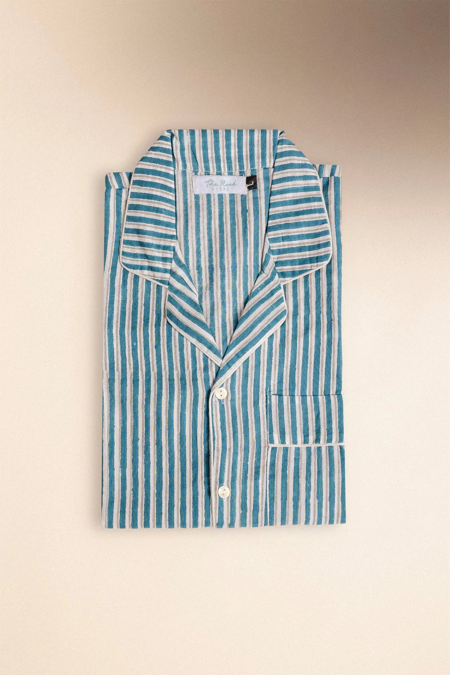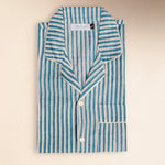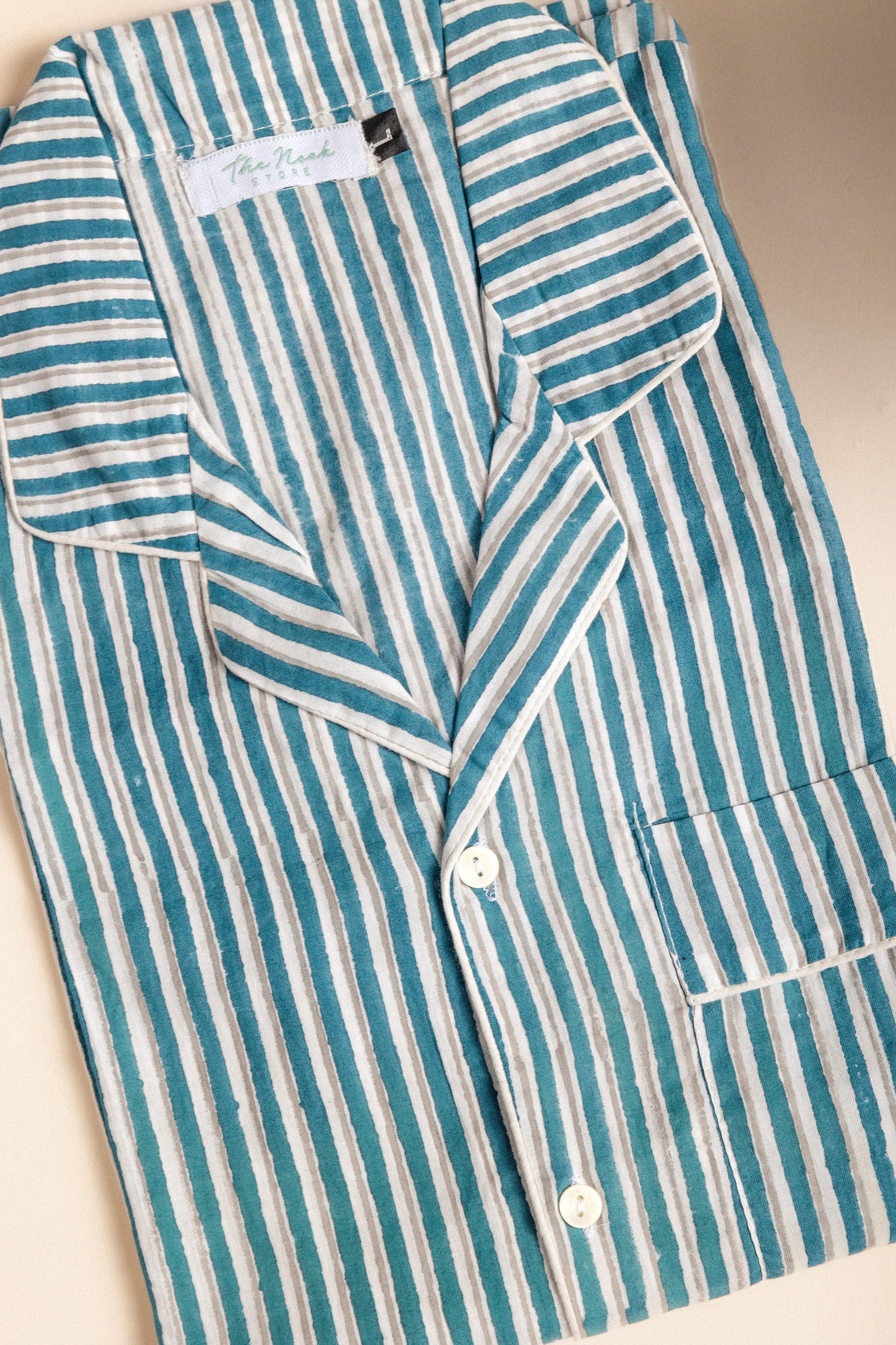 Pijama de algodón largo de rayas turquesas y grises. Camisa abotonada por delante, cuenta con un bolsillo en el lado superior izquierdo. Pantalón ajustado con elástico y lazada.