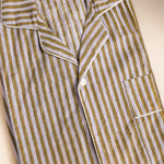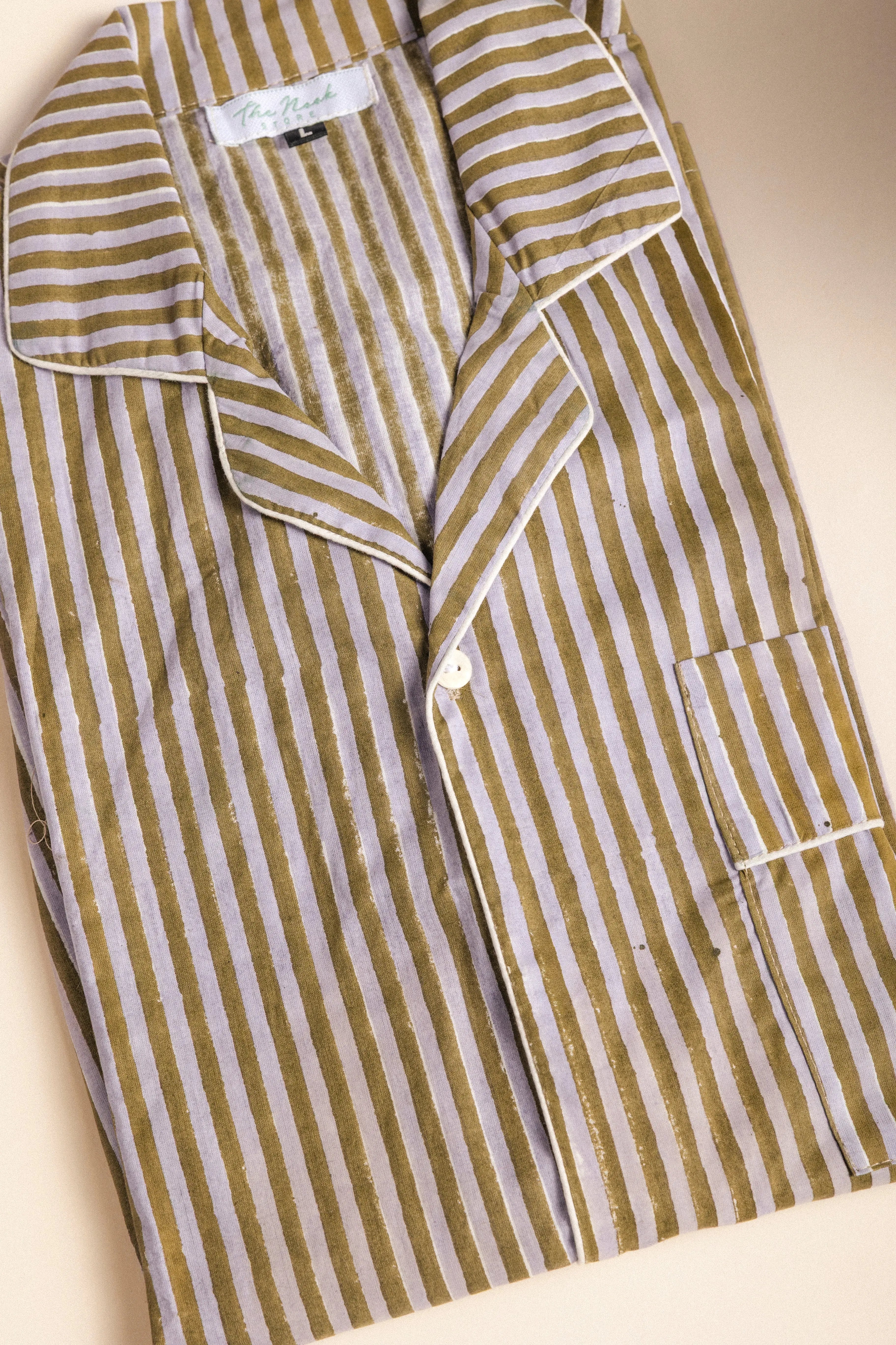 Pijama de algodón largo de rayas verdes y celestes. Camisa abotonada por delante, cuenta con un bolsillo en el lado superior izquierdo. Pantalón ajustado con elástico y lazada.